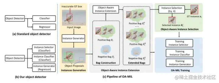 通过将目标视为实例包,作者提出了一种目标感知多实例学习方法(OA-MIL),其特点是目标感知实例选择和目标感知实例扩展。前者旨在为训练选择准确的实例,而不是直接使用不准确的框标注。后者侧重于生成用于选择的高质量实例。