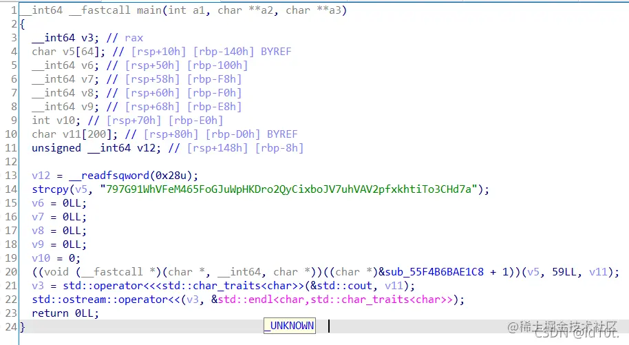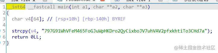 主要内容就是一个简单的 XOR,但是这个字符串 str 要通过本地方法 stringFromNative() 来获取,众所周知,Java 的本地方法都是 C/C++ 写的,所以去找 so 文件反编译,或者直接动调拿到值,