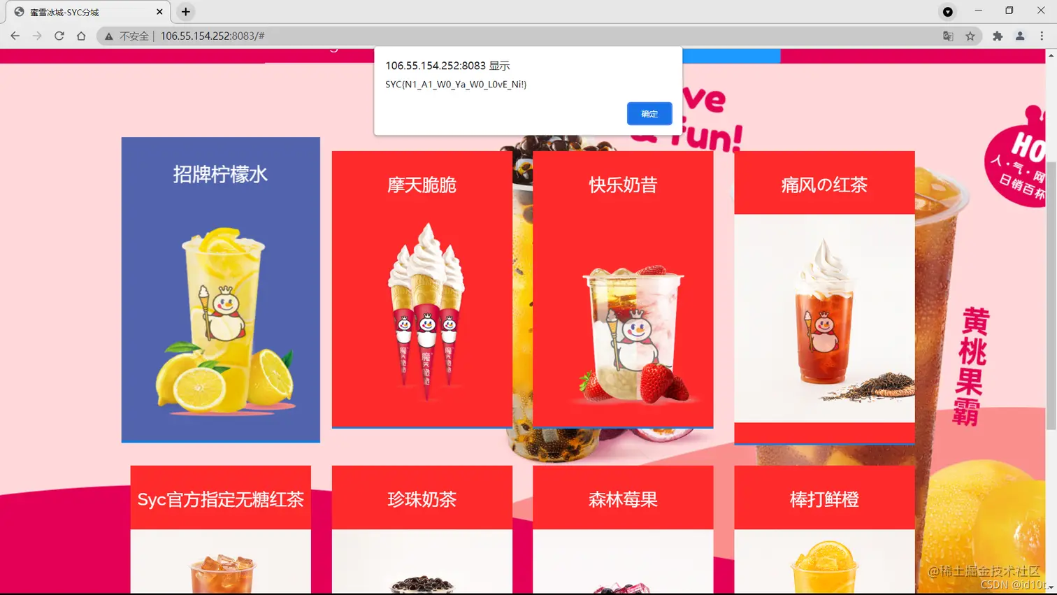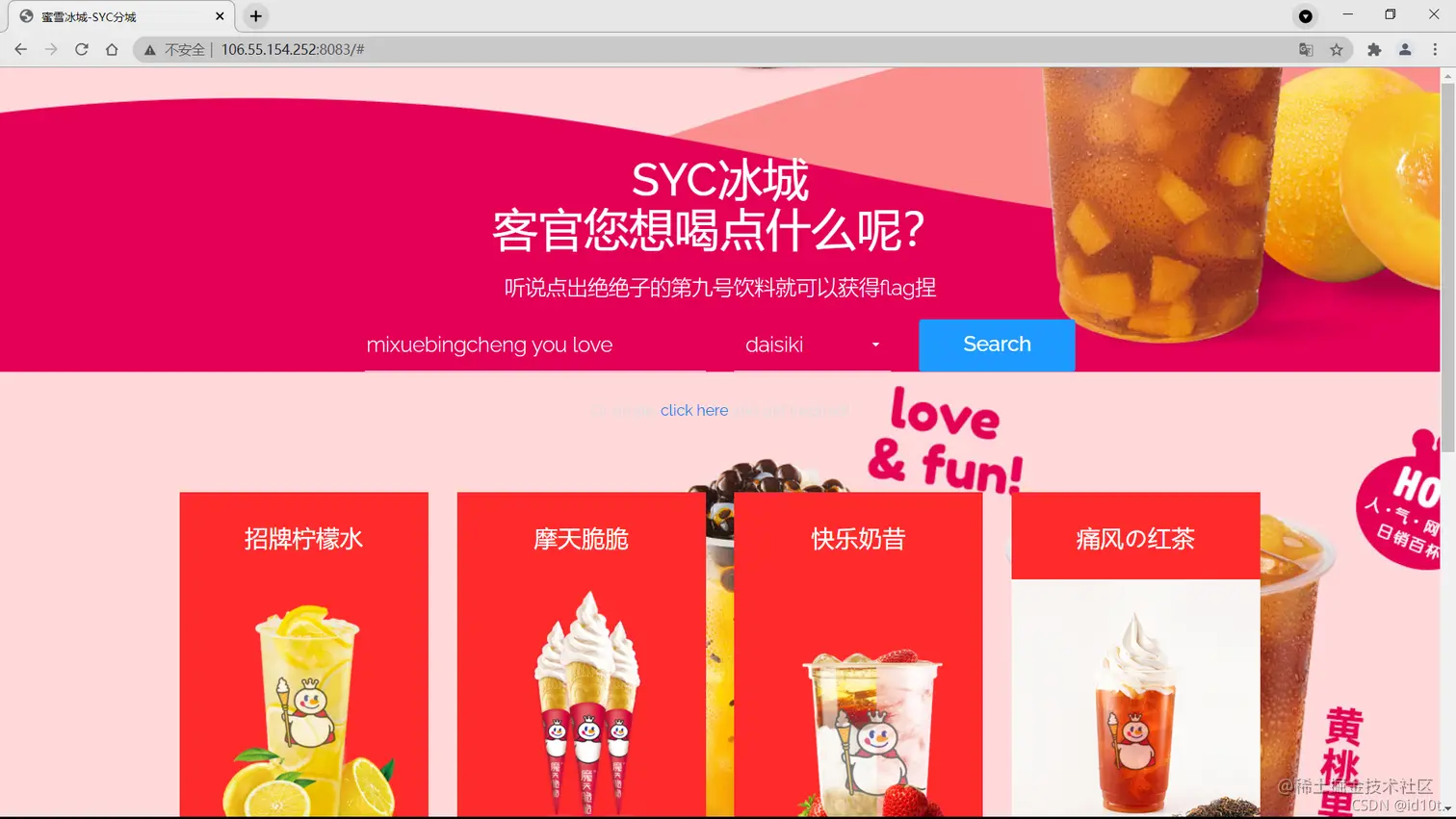看到提示可以知道,点到第九号饮料就直接出 flag,但这里只有8个,然而它是有 id 的,根据 JS 分析得出,在提交时会获取被点击的图片的 id 号,直接修改前端页面的 id=9,在点击一下,