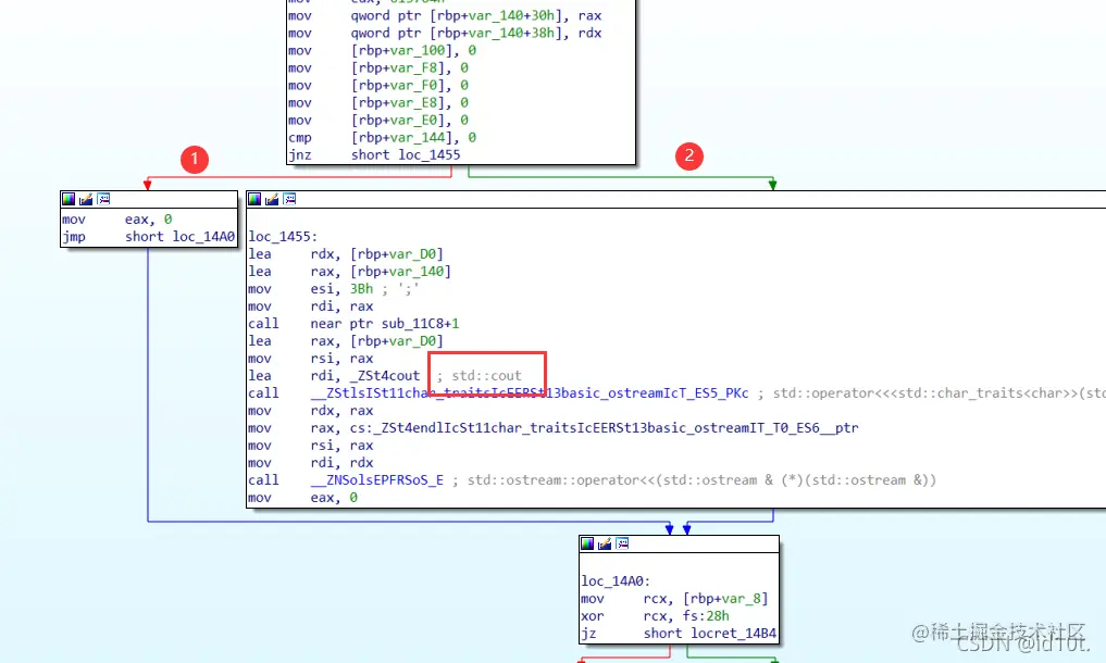 现在的流程是走 ① 号路线了,那我们接下来要让它走 ② 号线,然后才能进行一个输出,即把 jnz 改成 jz 即可;