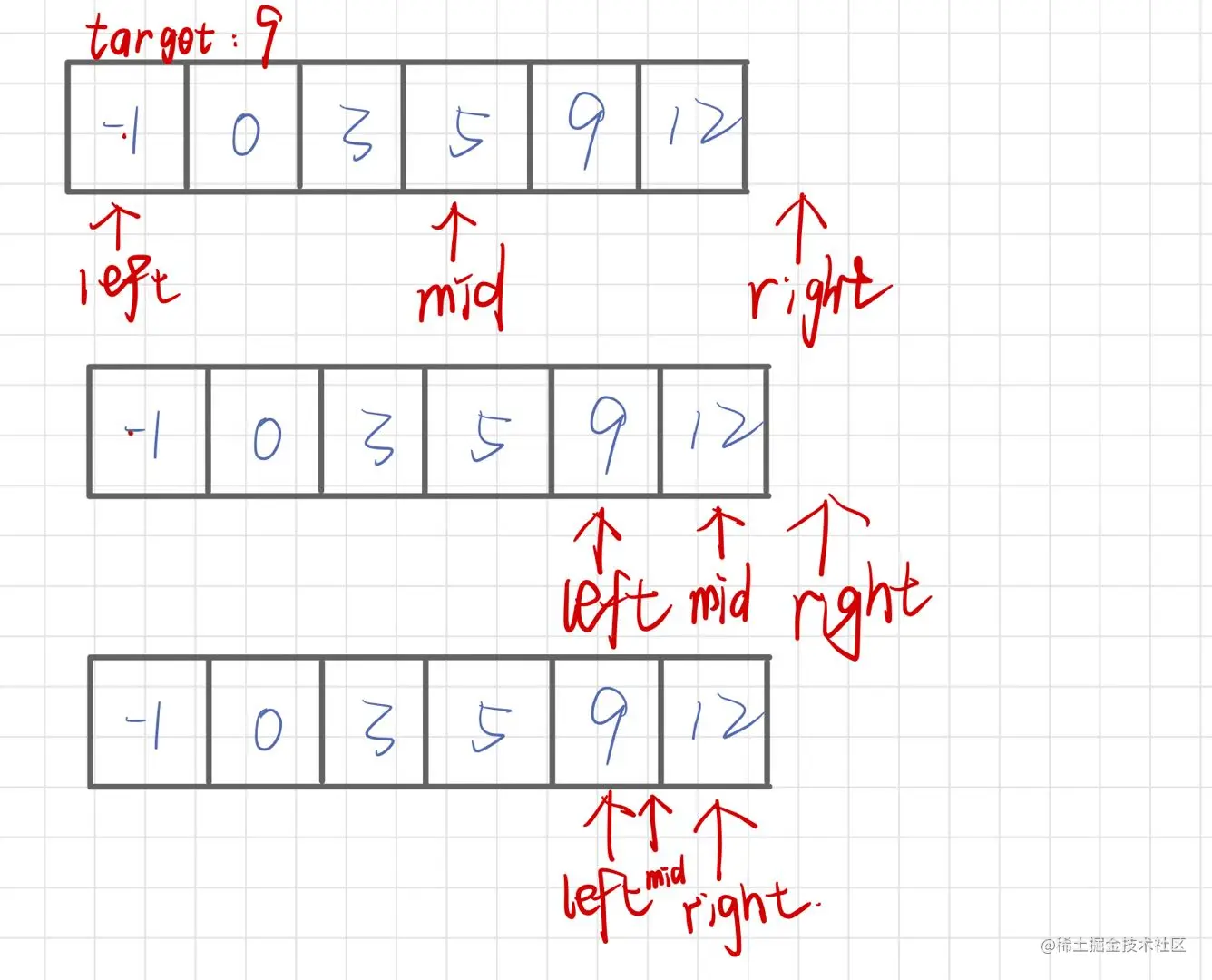 - 如果中间的数字小于目标值,则中间数字向左的所有数字都小于目标值,全部排除