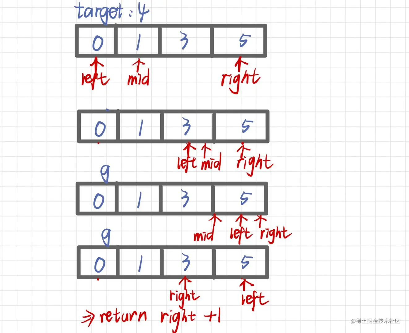 - 目标值在所有元素之后【nums.length-1,nums.length-1】,此时因返回nums.length