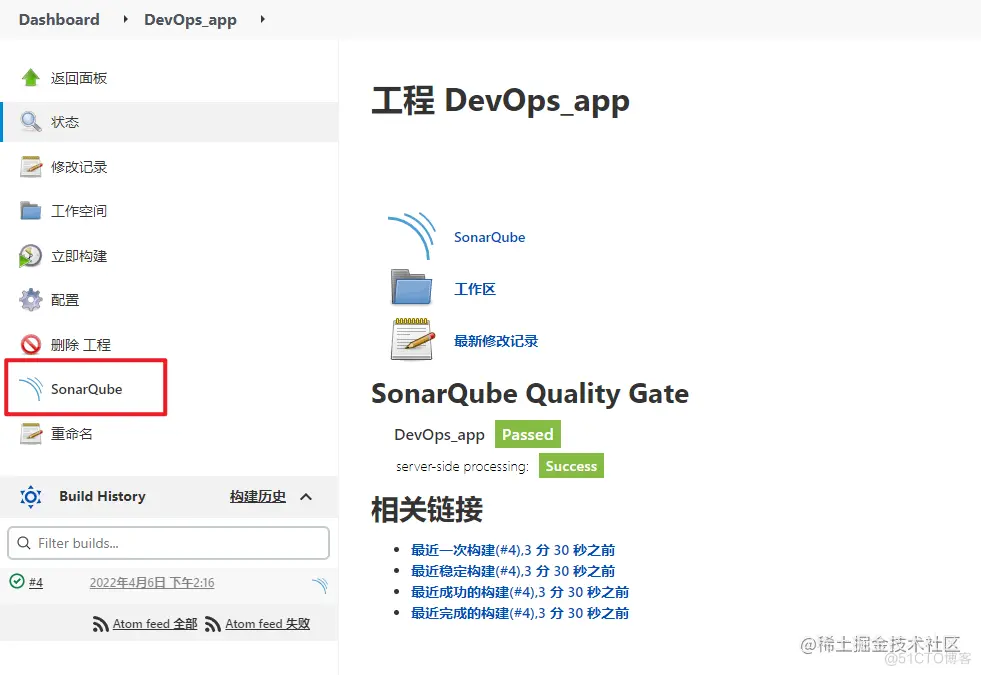 进入到项目页面,发现了SonarQube的菜单项,点击它能够直接跳转到到对应SonarQube的项目详情下