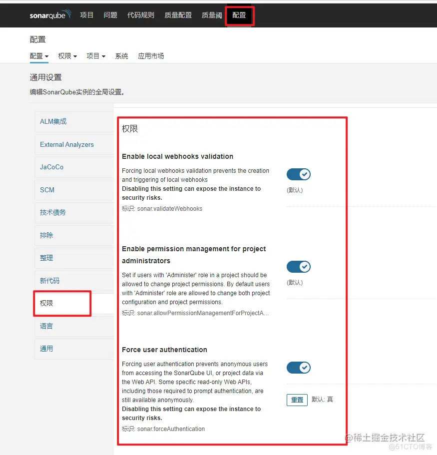 进入到SonarQube的配置>权限下查看图中的三个选项是否开启,默认情况下都是开启状态