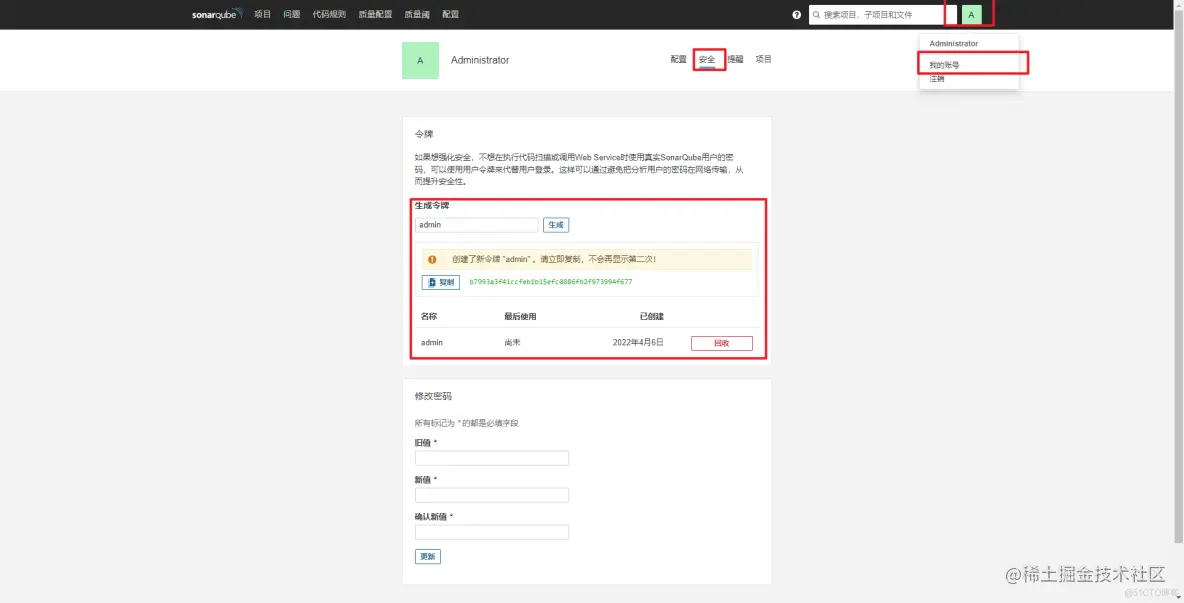 SonarQube是需要登录验证的,当然为了减少账户密码的流动,我们这里使用SonarQube的令牌机制。