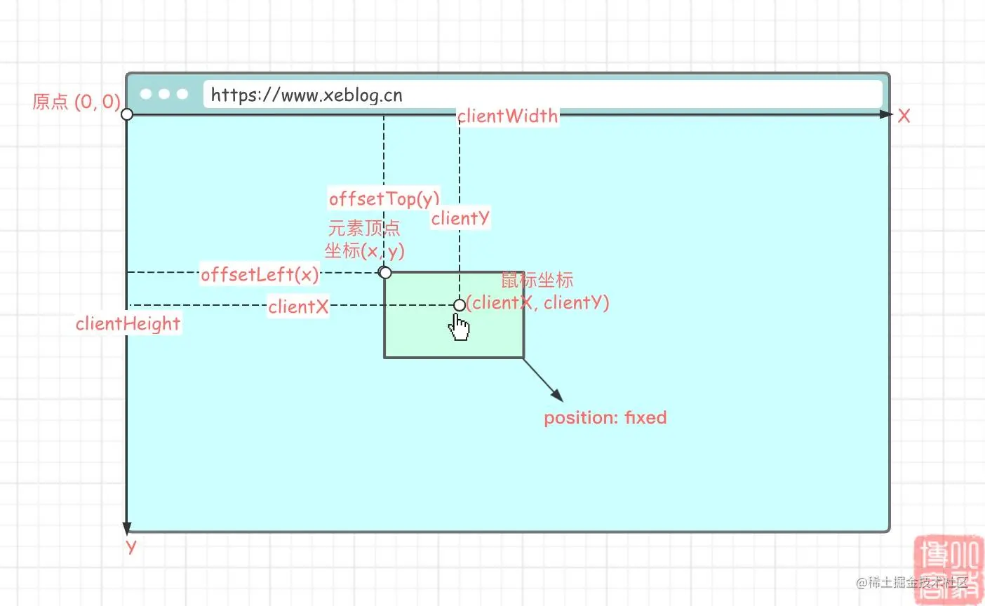 Element.clientWidth:元素可视宽度。Element.clientHeight:元素可视高度。MouseEvent.clientX:鼠标相对于浏览器左上顶点的水平坐标。MouseEvent.clientY:鼠标相对于浏览器左上顶点的垂直坐标。Touch.clientX:触点相对于浏览器左上顶点的水平坐标(移动端属性)。Touch.clientY:触点相对于浏览器左上顶点的垂直坐标(移动端属性)。HTMLElement.offsetLeft:当前元素左上角相对于父节点(HTMLElement.offsetParent)的左边偏移的距离。当元素脱离文档流时(position: fixed)则相对于原点(浏览器左上顶点)偏移。HTMLElement.offsetTop:当前元素左上角相对于父节点(HTMLElement.offsetParent)的顶部偏移的距离。当元素脱离文档流时(position: fixed)则相对于原点(浏览器左上顶点)偏移。Element.style.top:可读可写,值为offsetTop。Element.style.left:可读可写,值为offsetLeft。