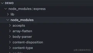 在项目 node_medules 下安装了 express 包,express 又有自己的 node_modules,同样在 express 的 node_modules 中的依赖也会有自己的 node_modules。