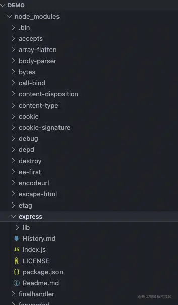 我们用 yarn 重新安装 express 包,项目的 node_modules 如图: