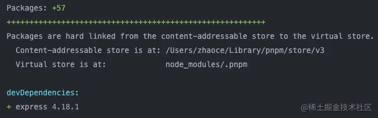 同样,我们再用 pnpm 安装 express 包,可以看到有如下提示: