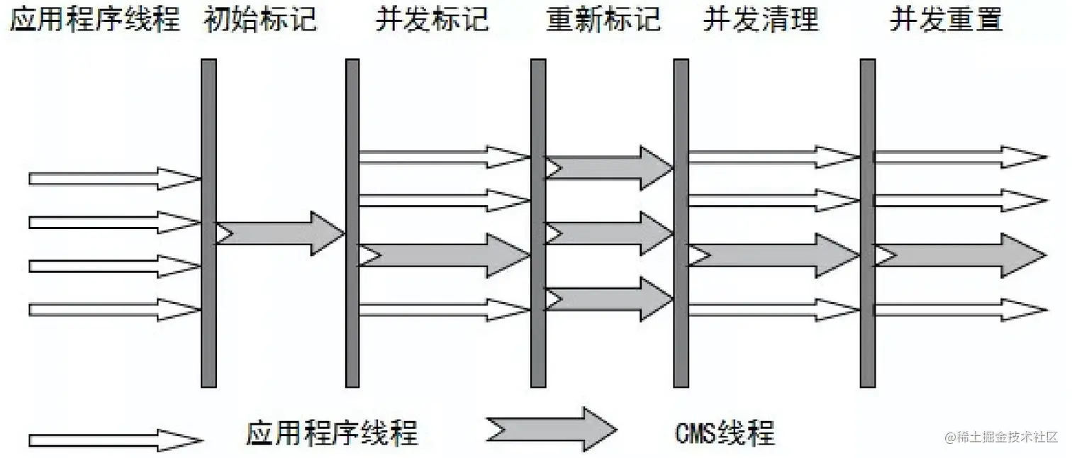 从名字中的Mark Sweep这两个词可以看出,CMS收集器是一种 “标记-清除”算法实现的,它的运作过程相比于前面几种垃圾收集器来说更加复杂一些。整个过程分为: