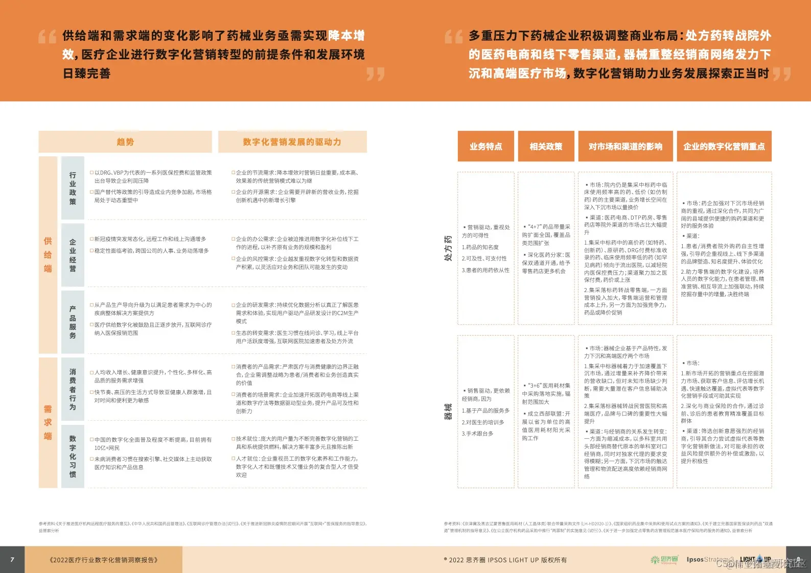 - 对制药药企而言, 面对带量采购、医药分家等一系列政策的挤压,药品大面积、大幅度降价迫使各类药企转投效率更高、成本更低的营销手段,加权线上医药电商和互联网医院、线下零售药店和DTP药房等院外渠道。数字化营销重点因此落在多渠道的精准营销策略和品牌知名度的打造,以及通过赋能零售终端的数字化持续在存量中挖掘增量。