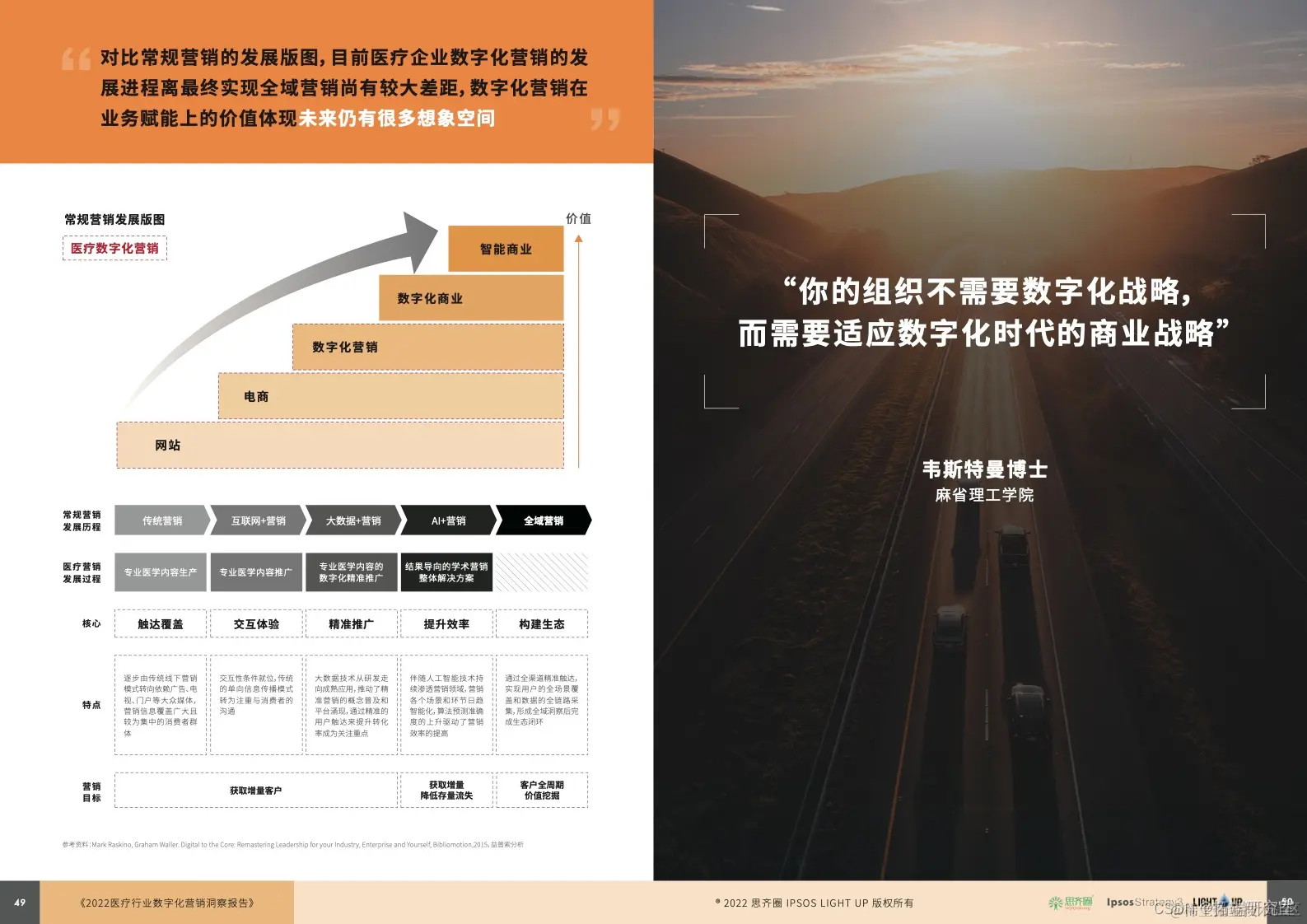 从网站到电商,从数字化营销到数字化商业,再到智能商业,对比常规营销的发展版图,目前医疗企业数字化营销的发展进程距离最终实现全域营销还有较大的差距,数字化营销在业务赋能上的价值体现未来仍有很多想象的空间。