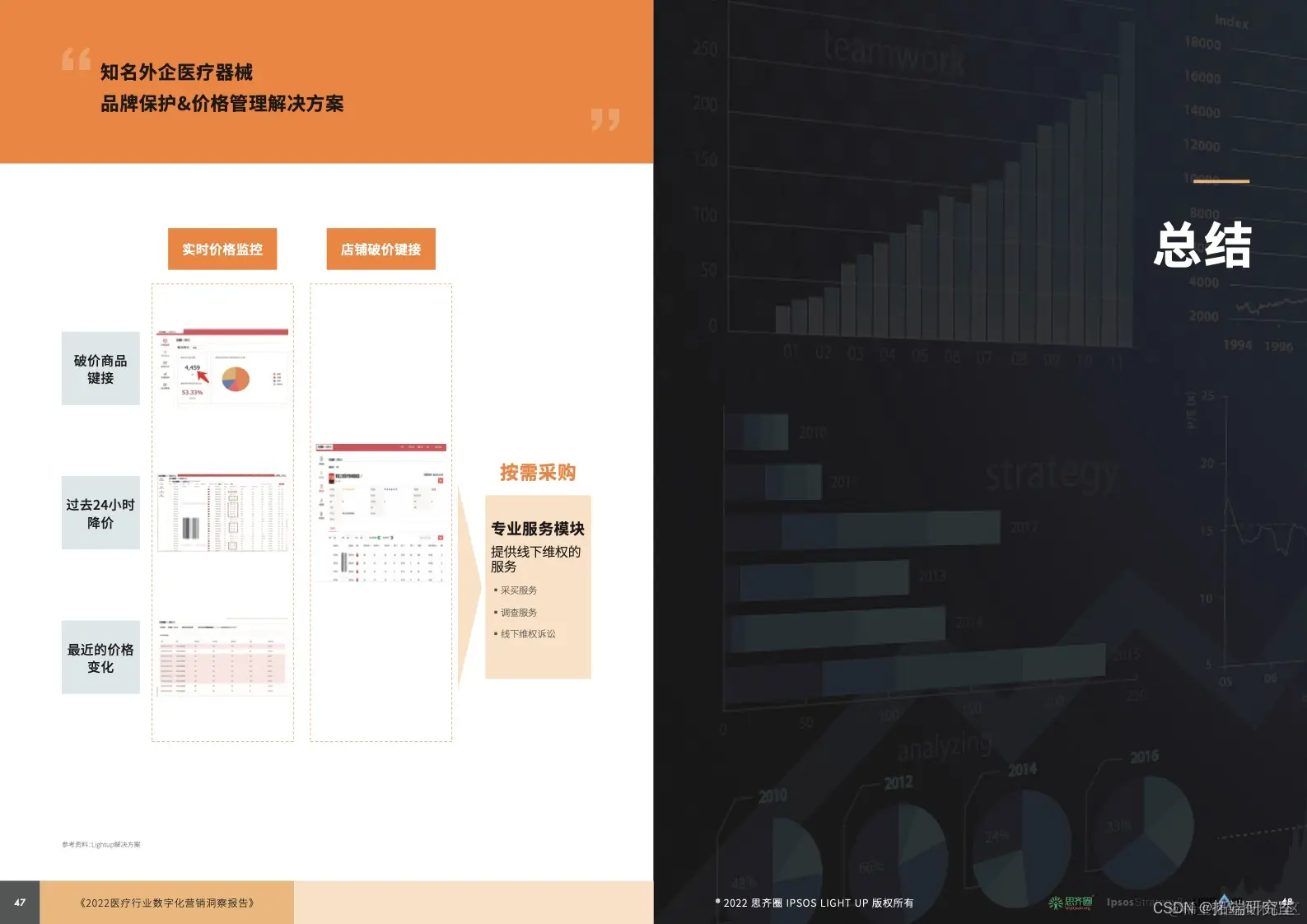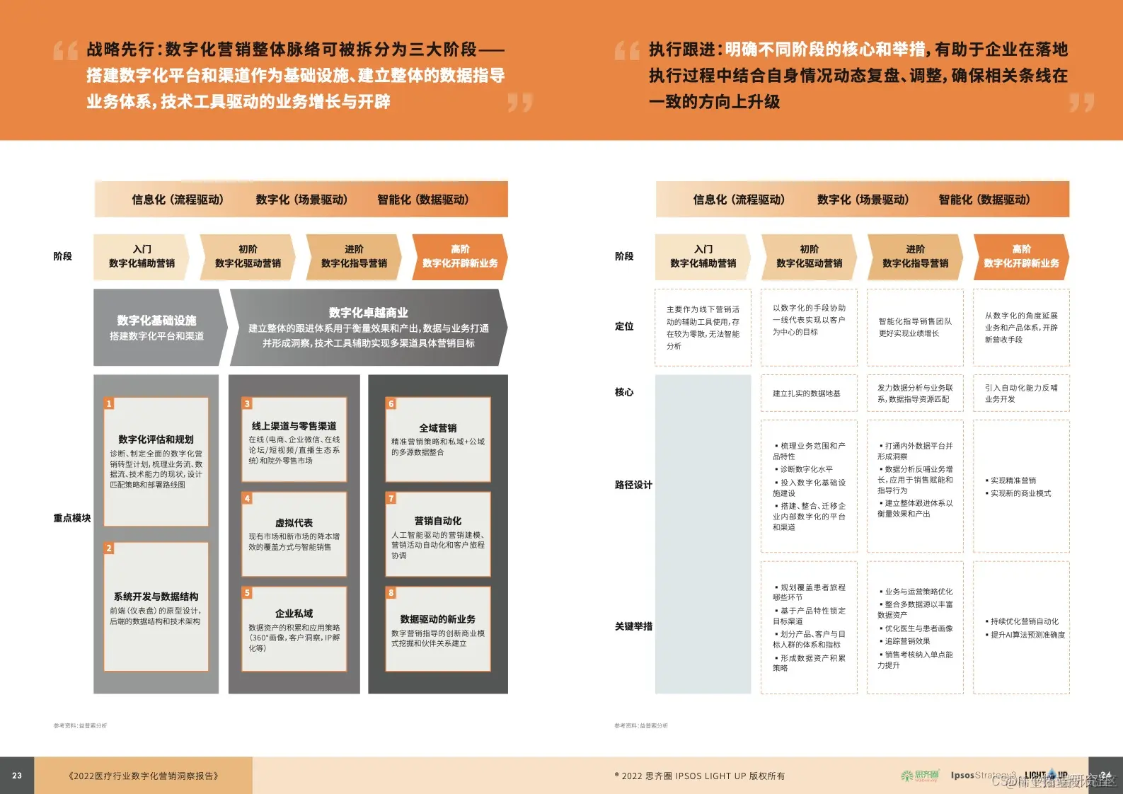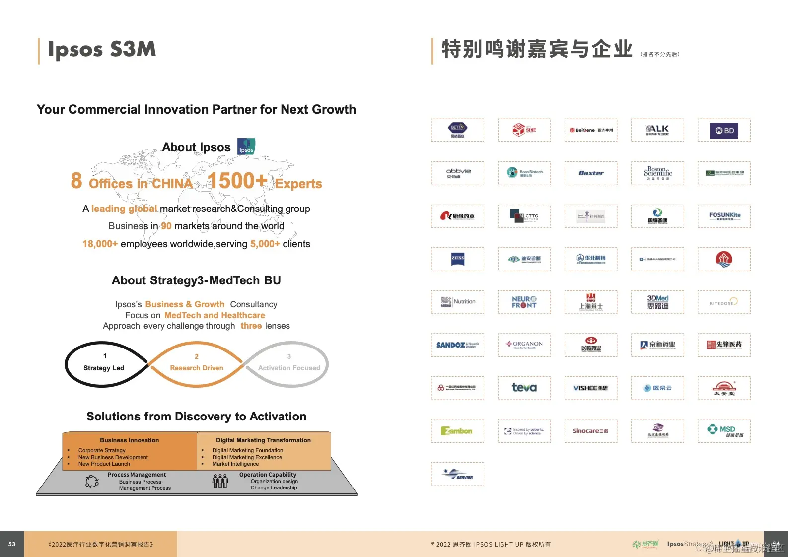 很荣幸,透过本次《蓝皮书》与众多头部药械企业数字化营销相关部门(含市场、销售、SFE、数字化、IT、创新等)负责人的深度交流,我们验证、积累了针对数字化营销不同发展阶段的大量极具可行性的优质案例。作为数字化营销转型的专家,Ipsos Strategy3-医疗创新团队希望成为企业值得信赖的长期合作伙伴,通过以下服务模块贡献专业知识和落地能力,帮助企业扫清数字化营销升级路上的障碍并敏锐捕捉更多商业创新的机遇,最终实现与客户、与生态、与社会的共创多赢。