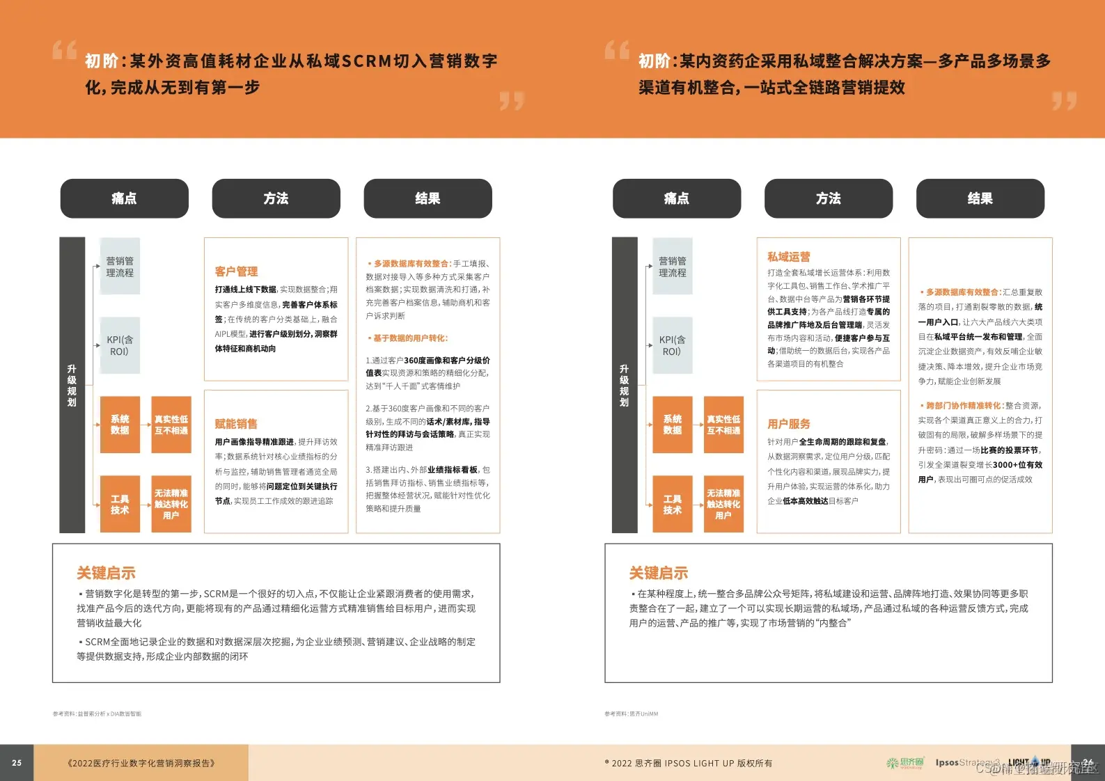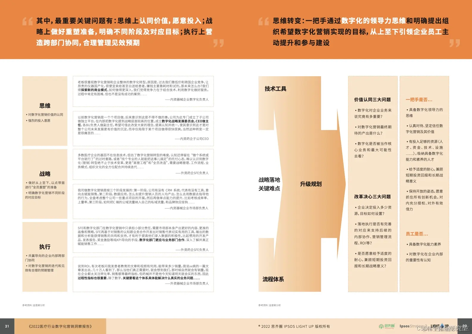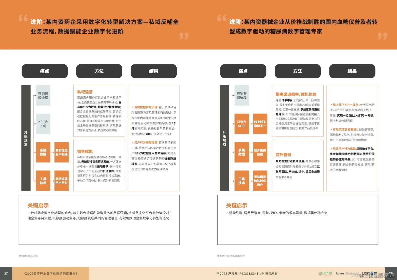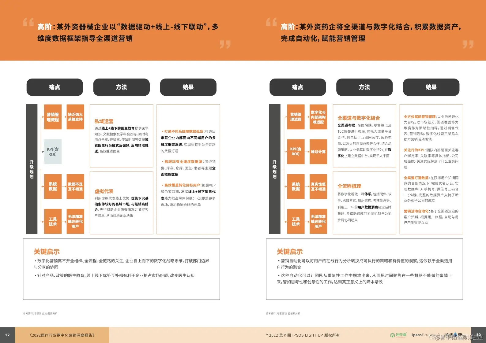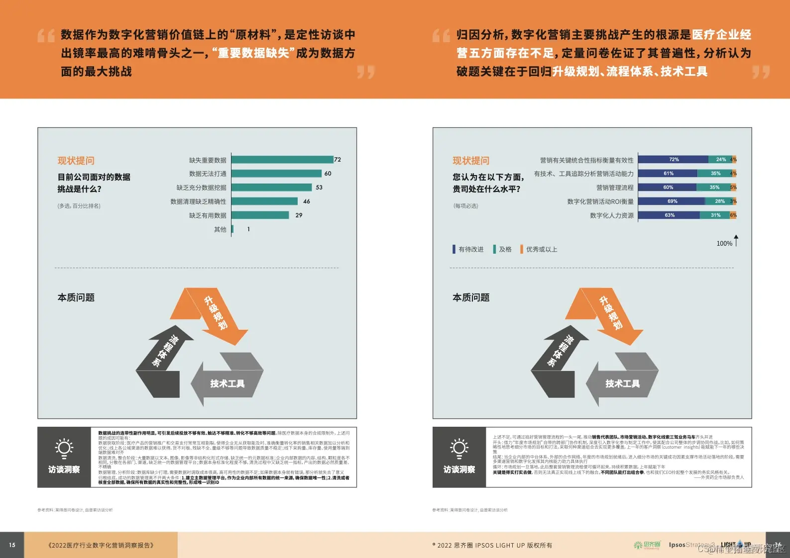 02 、难在哪:从行业特性看,多重 “ 先天 ” 因素限制医疗数字化营销发展,致其难以直接复用其他行业的经验。从组织管理看,升级规划、流程体系、技术工具三方面存在不足是企业经营的通病。