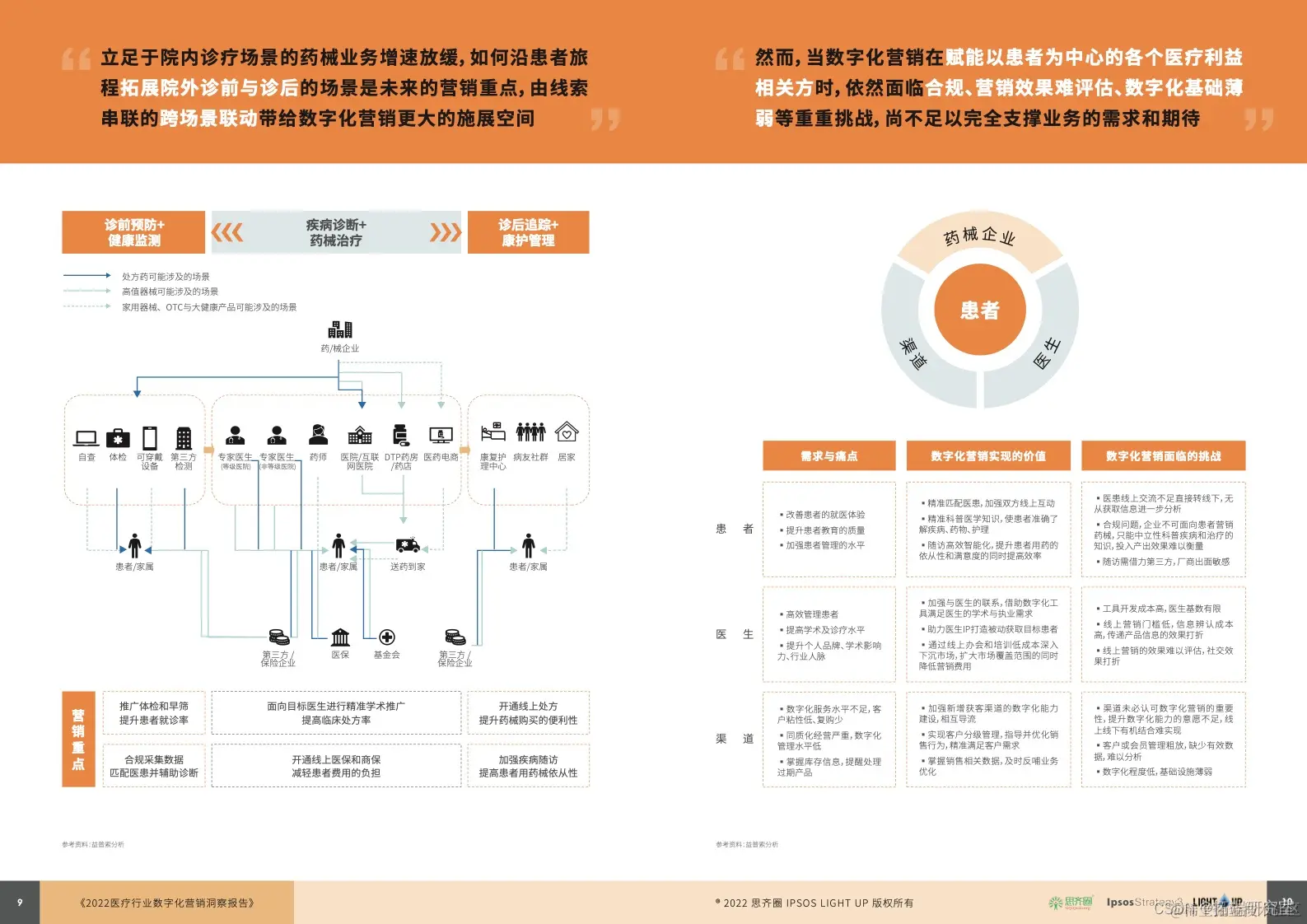 - 对药械二者而言, 由于传统的立足于院内诊疗场景的药械业务增速正放缓,因此如何沿着患者旅程拓展院外的诊前场景与诊后场景是未来共同的营销重点。在此基础上,通过目标群体的营销线索串联起诊前、诊中、诊后进行跨场景联动,构造环环相扣的“人货场”,数字化营销将会有更大的施展空间,进一步促成以疾病为中心的药械联合与服务升级,实现疾病整体解决方案的落地。