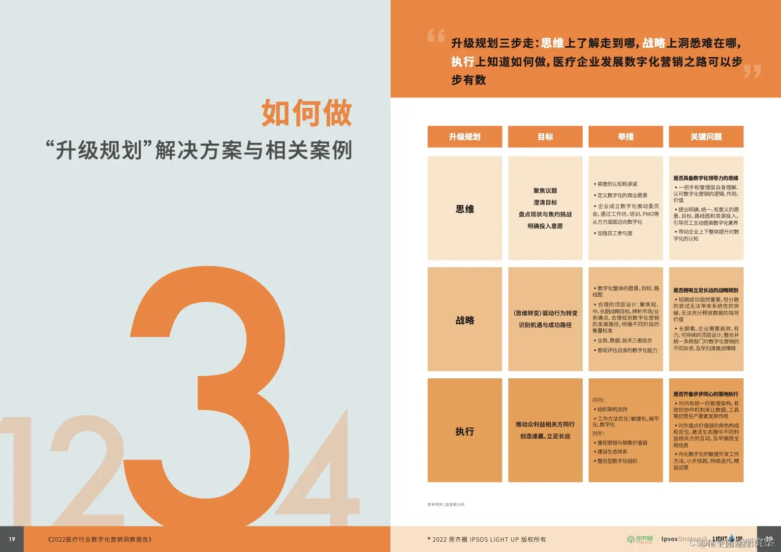03 、如何做:就升级规划而言,药械企业可通过思维、战略、执行三步走自查自检数字化营销的水平,以此为基础加固排兵布阵。跟进落地执行时,可沿着数字化营销的典型升级路径把握好各阶段的核心:初阶建立好扎实的数据地基,进阶巩固好数据分析与业务的关联性,高阶引导好适合的自动化能力反哺业务拓展。
