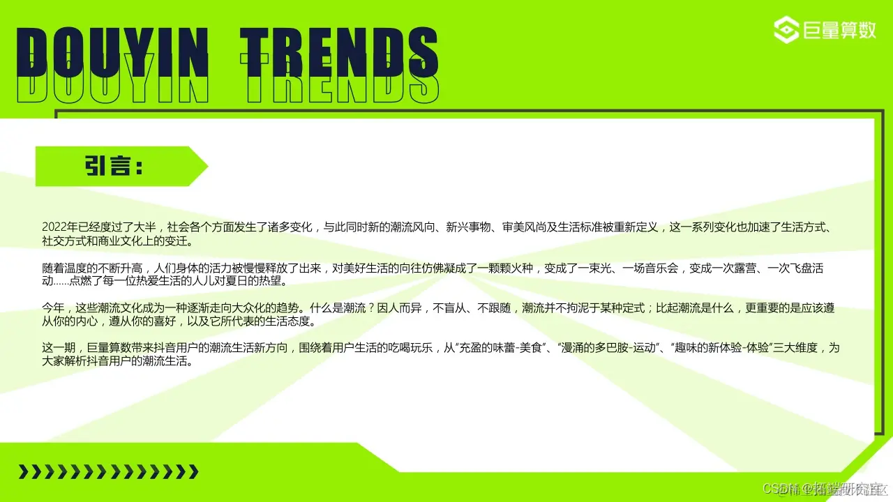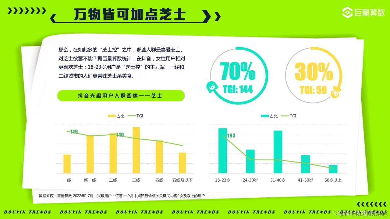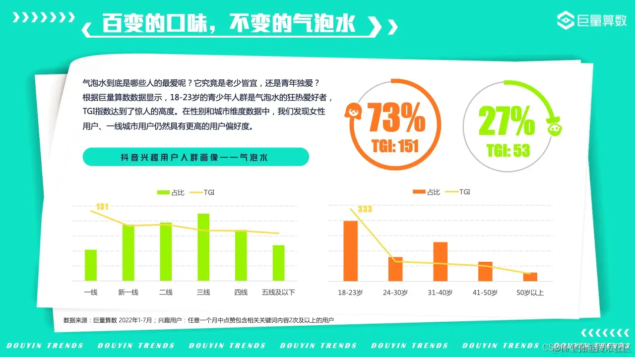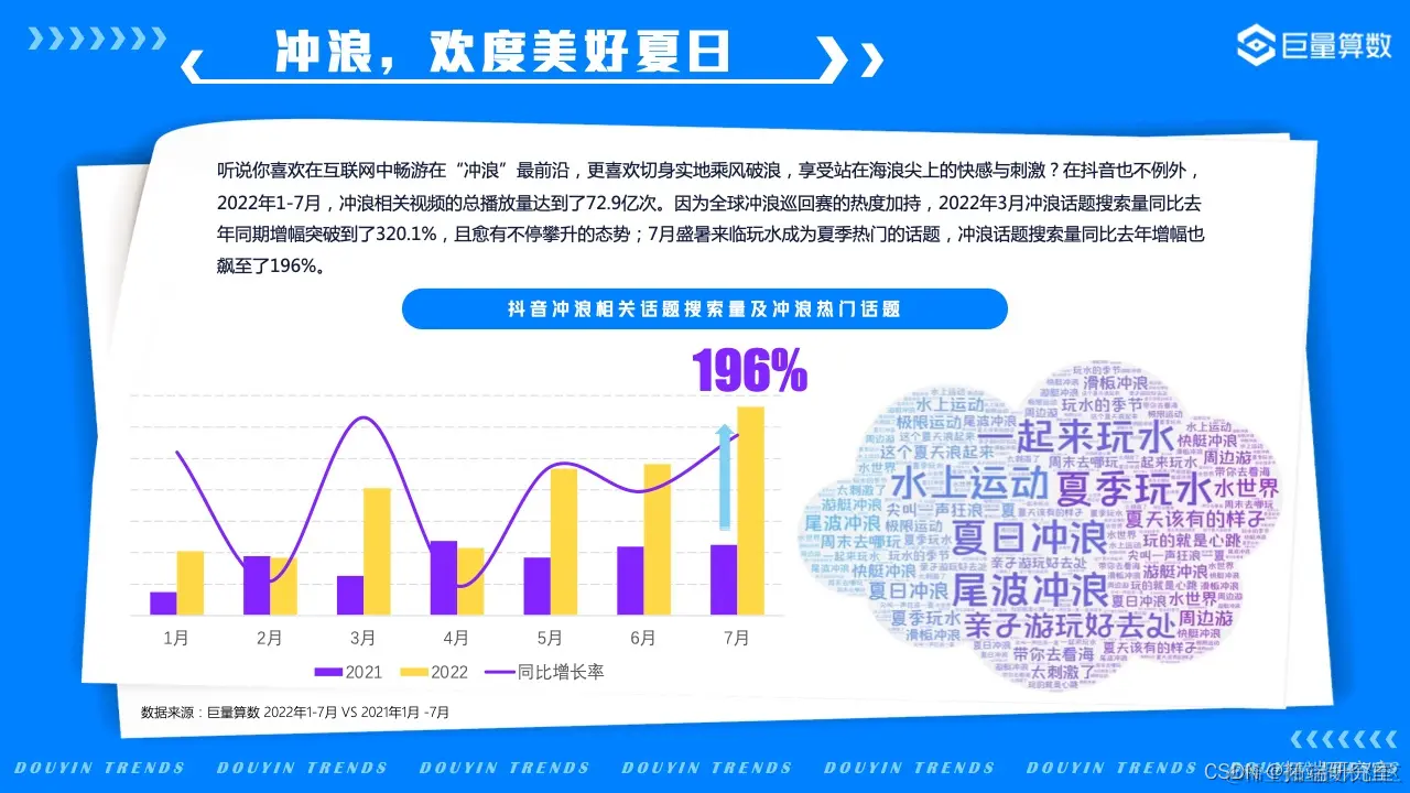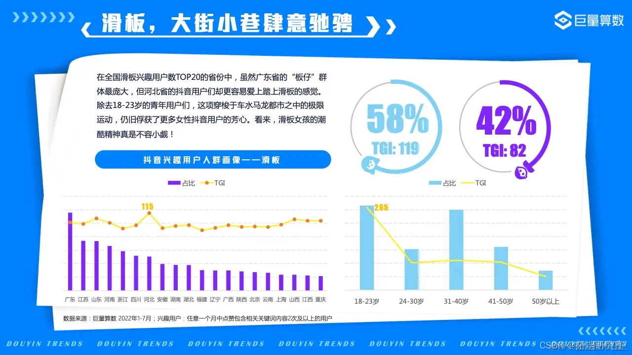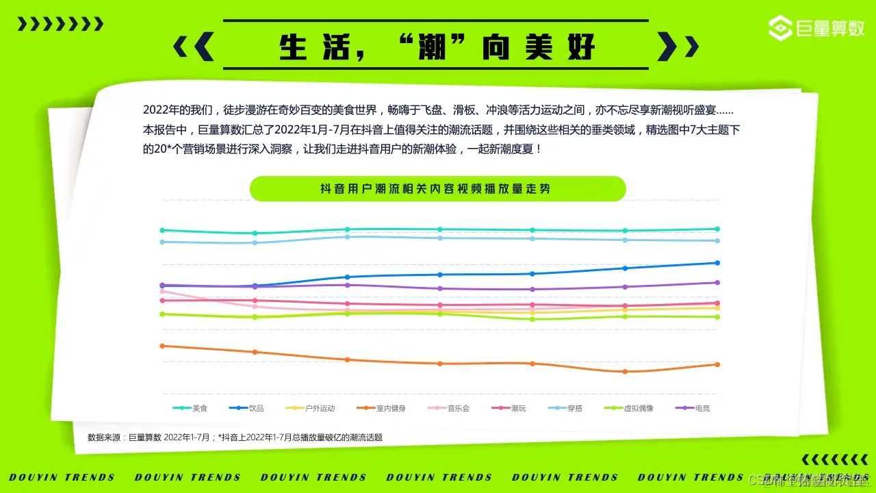 2022年的我们,徒步漫游在奇妙百变的美食世界,畅嗨于飞盘、滑板、冲浪等活力运动之间,亦不忘尽享新潮视听盛宴……巨量算数精选图中抖音7大主题下的20*个营销场景进行深入洞察。