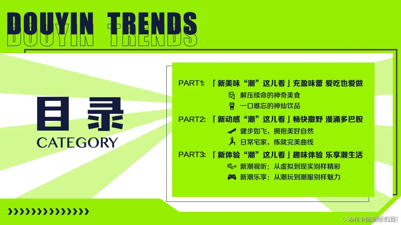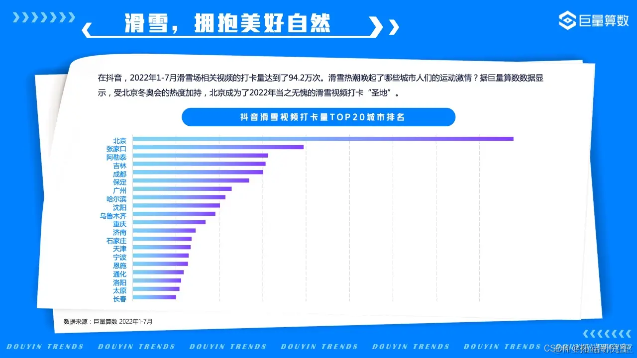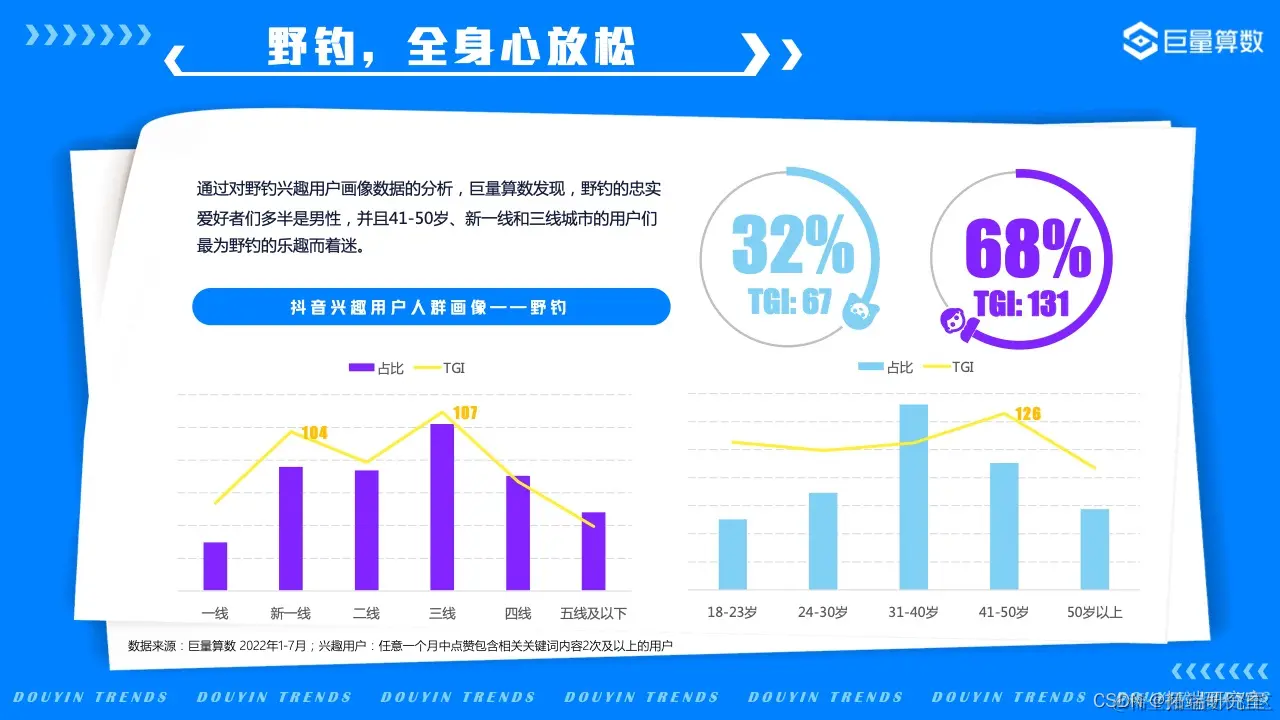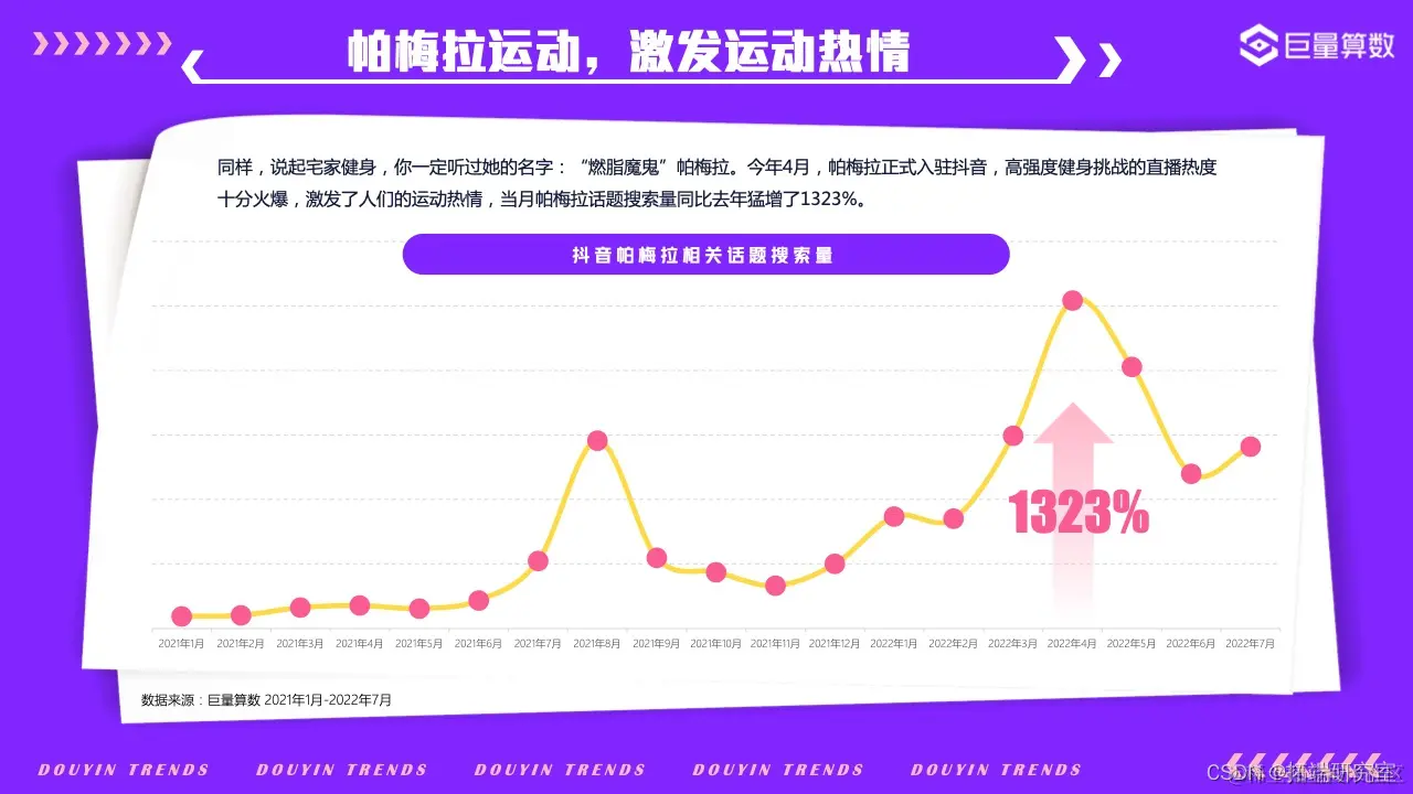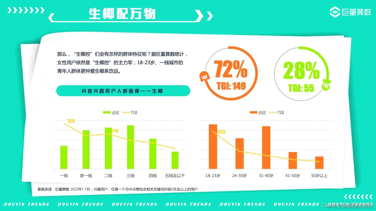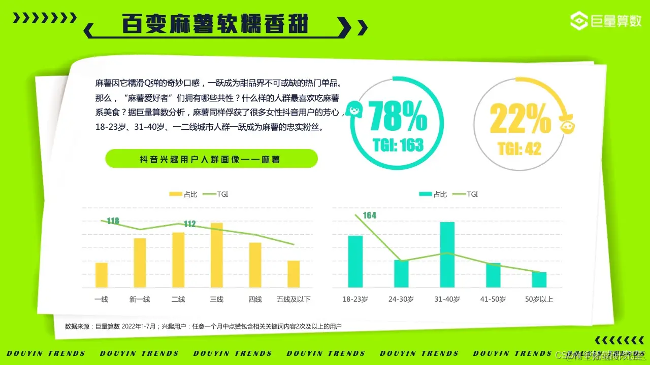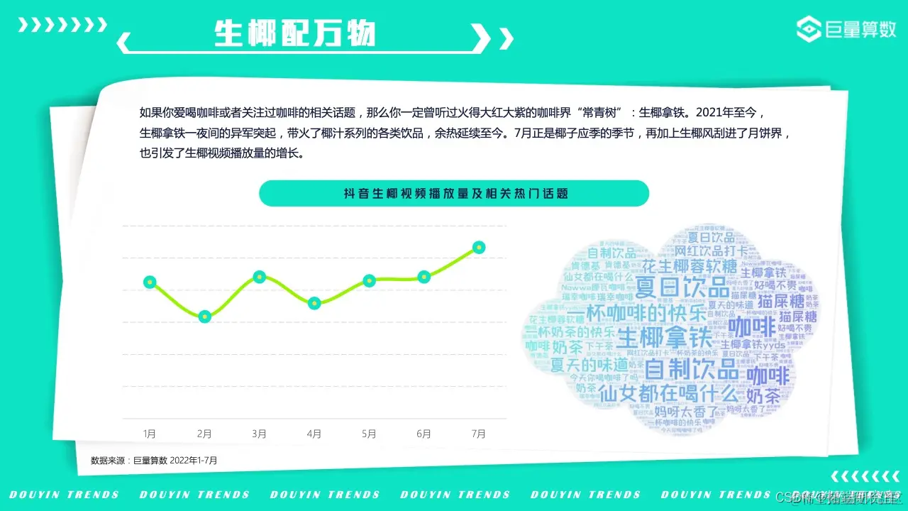 2022年的我们,徒步漫游在奇妙百变的美食世界,畅嗨于飞盘、滑板、冲浪等活力运动之间,亦不忘尽享新潮视听盛宴……巨量算数精选图中抖音7大主题下的20*个营销场景进行深入洞察。