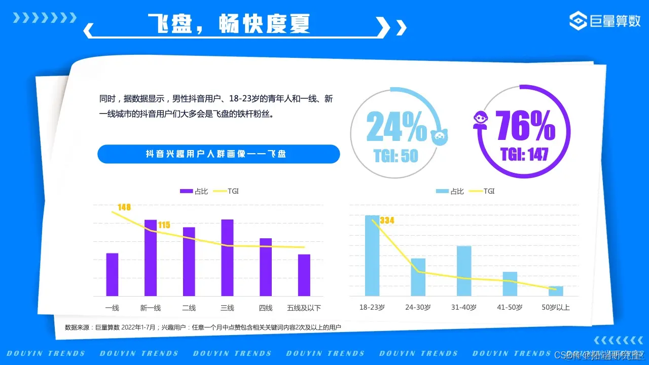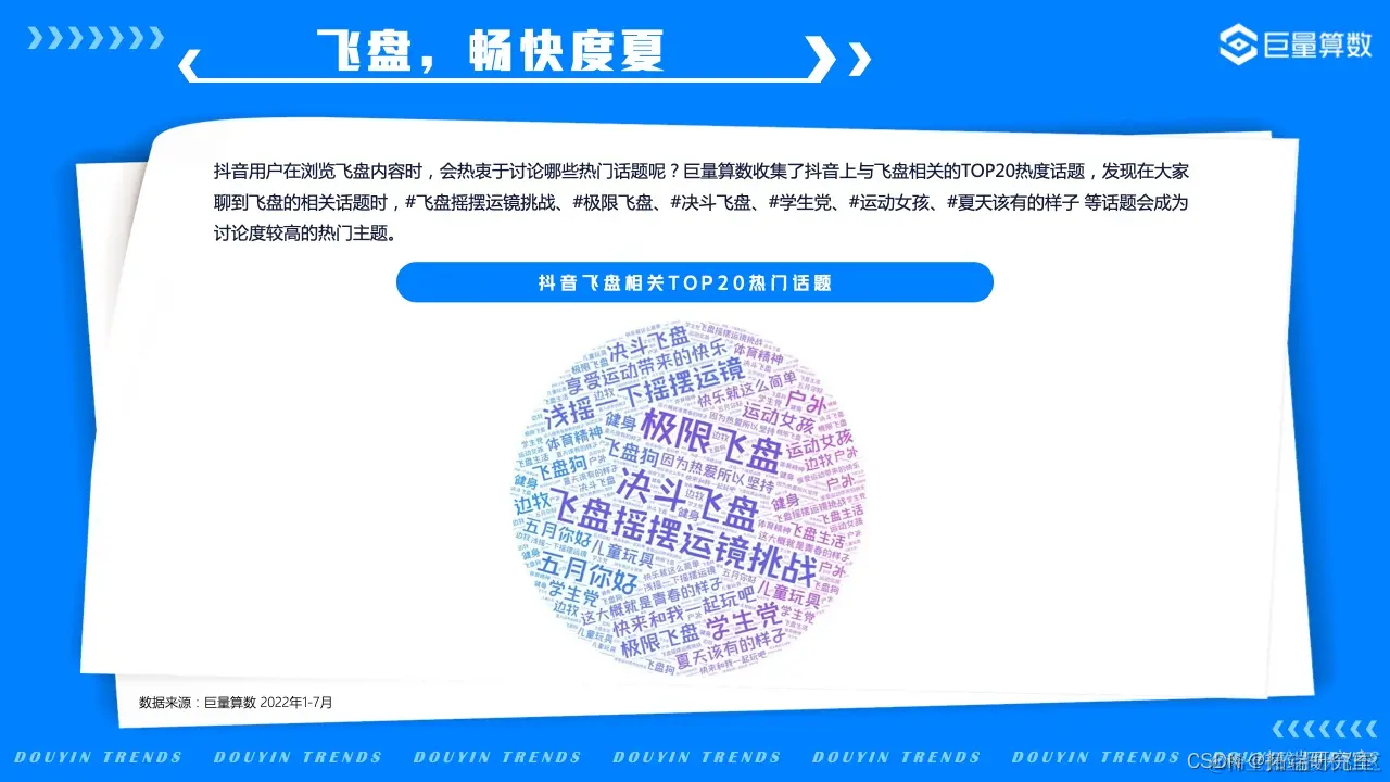如果细数当今流行的新潮运动,最热门的肯定会有它——飞盘。在抖音,2022年7月飞盘相关视频的播放量达到5.1亿次,点赞量达到1005.7万次。