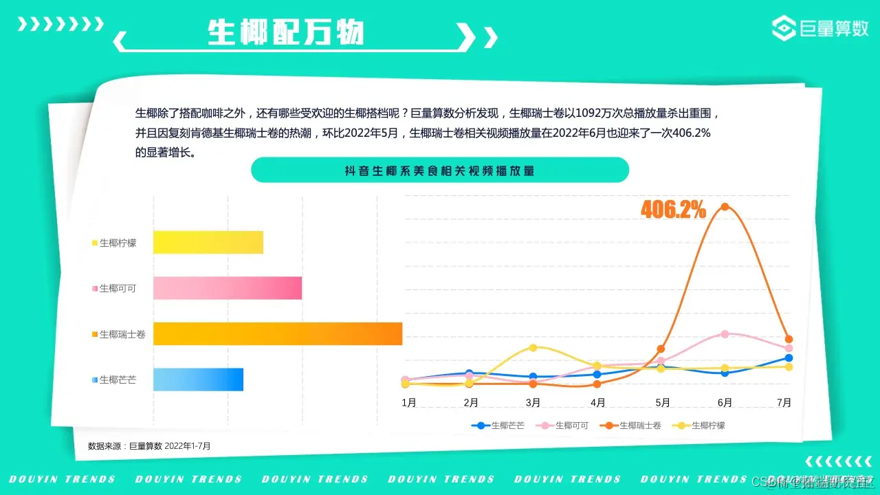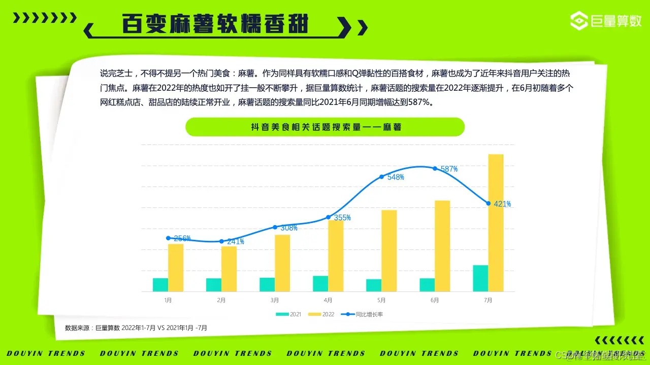 作为同样具有软糯口感和Q弹黏性的百搭食材,麻薯也成为了近年来抖音用户关注的热门焦点。据巨量算数统计,麻薯话题的搜索量同比2021年6月同期增幅达到587%。