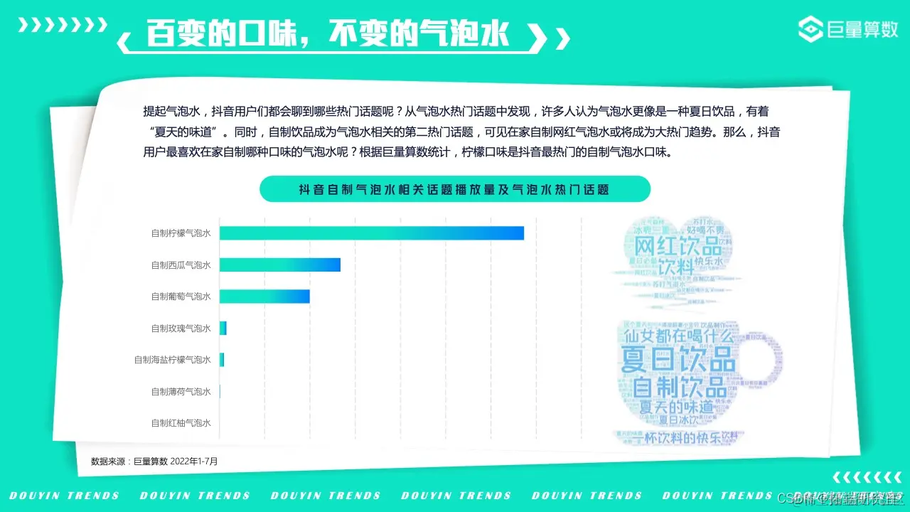 百变的口味,不变的气泡水。不知不觉中,各式各样的气泡水已经悄悄走进了我们的生活。抖音用户最喜欢在家自制哪种口味的气泡水呢?根据巨量算数统计,柠檬口味是抖音最热门的自制气泡水口味。