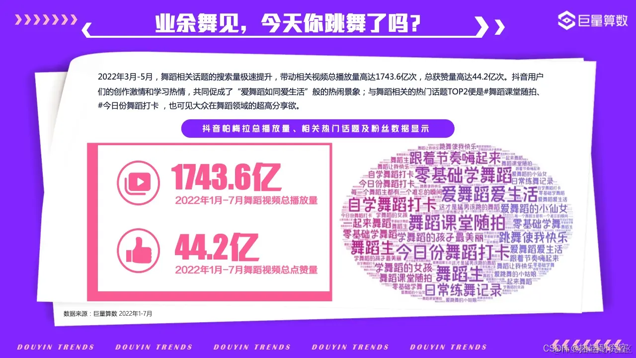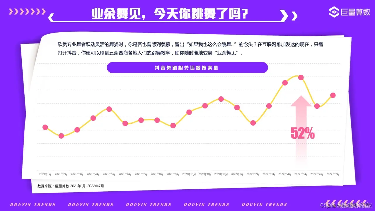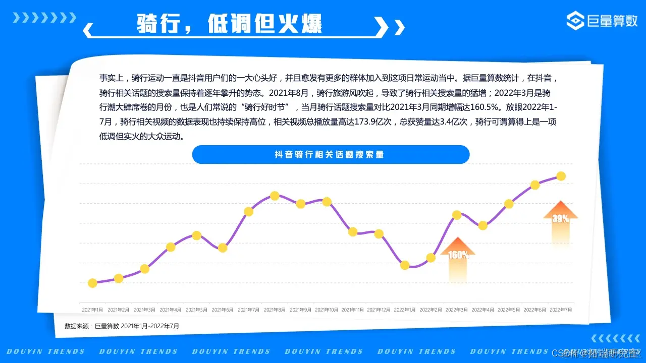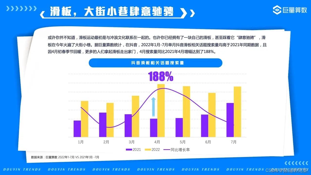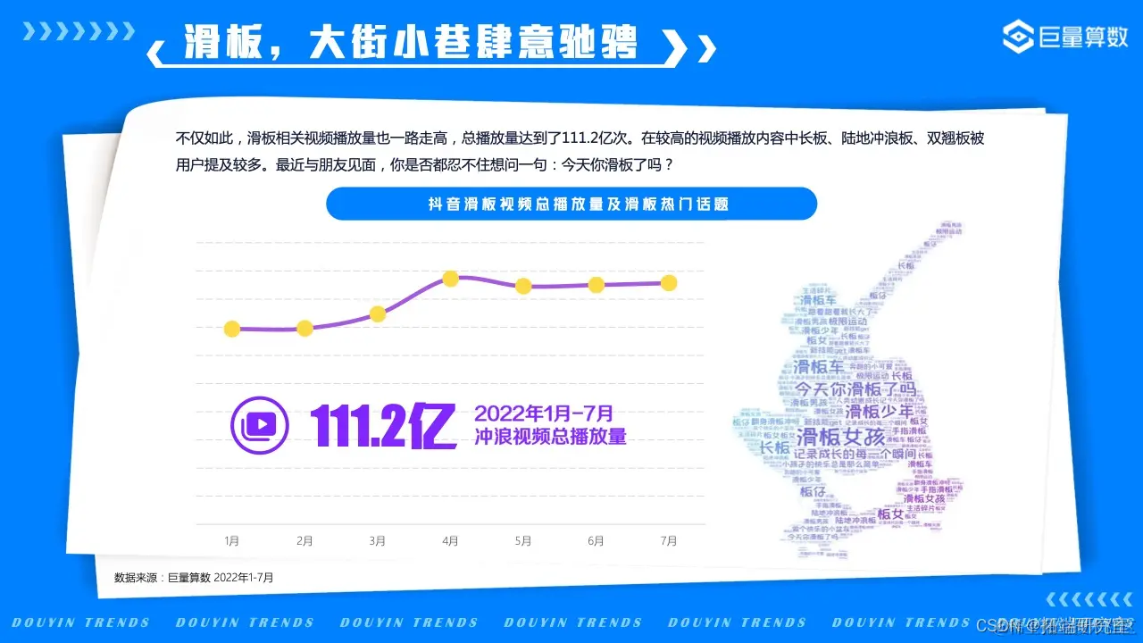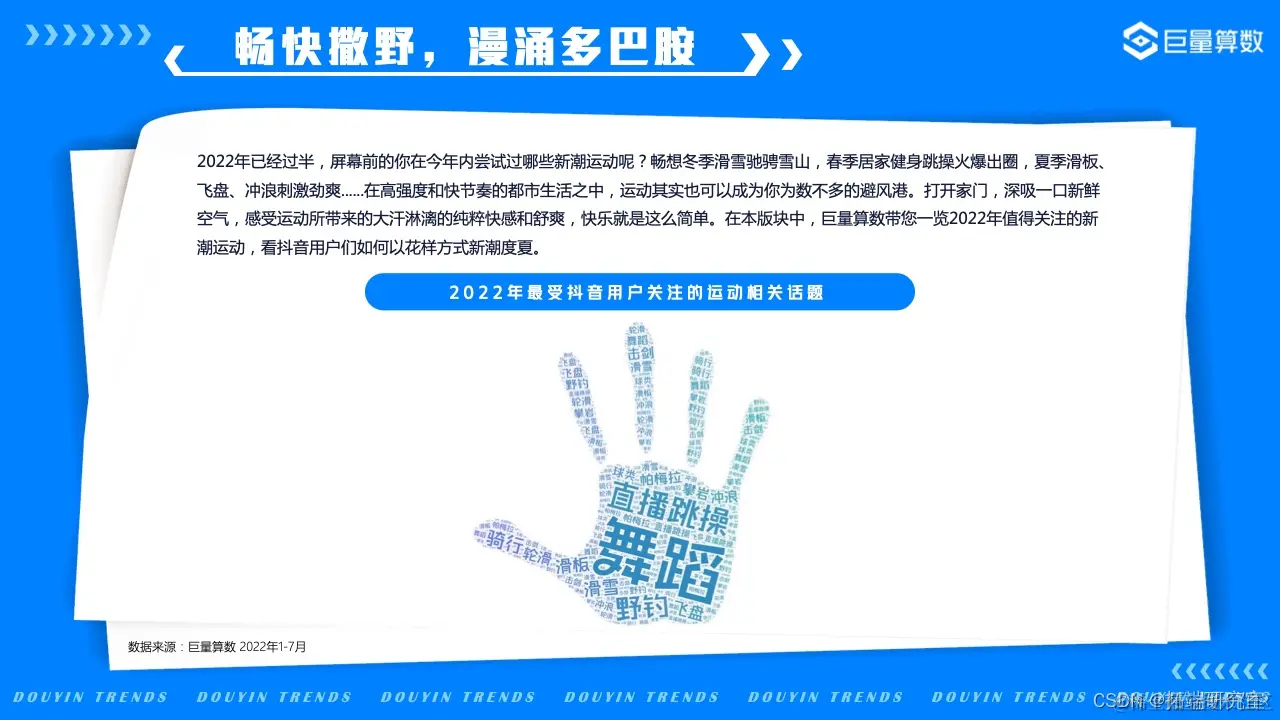 打开家门,深吸一口新鲜空气,感受运动所带来的大汗淋漓的纯粹快感和舒爽,快乐就是这么简单。在本版块中,巨量算数带您一览2022年值得关注的新潮运动,看抖音用户们如何以花样方式新潮度夏。