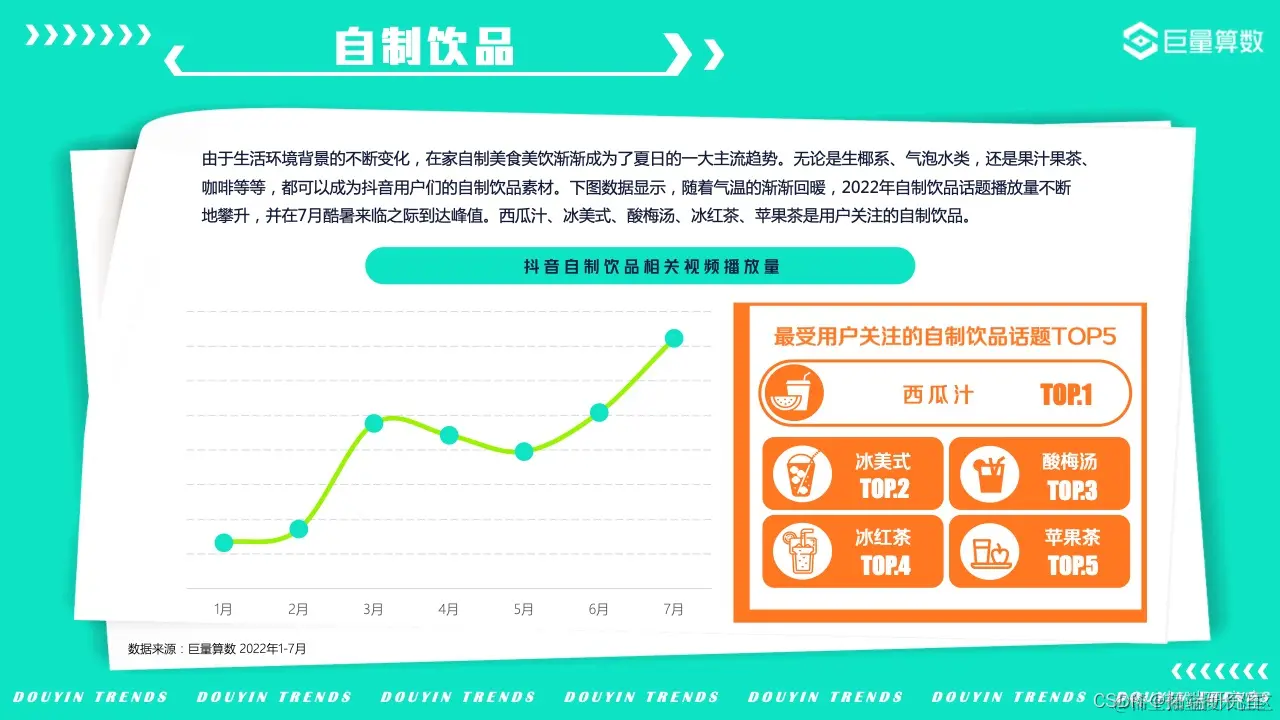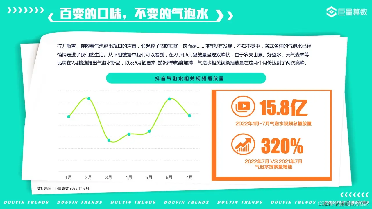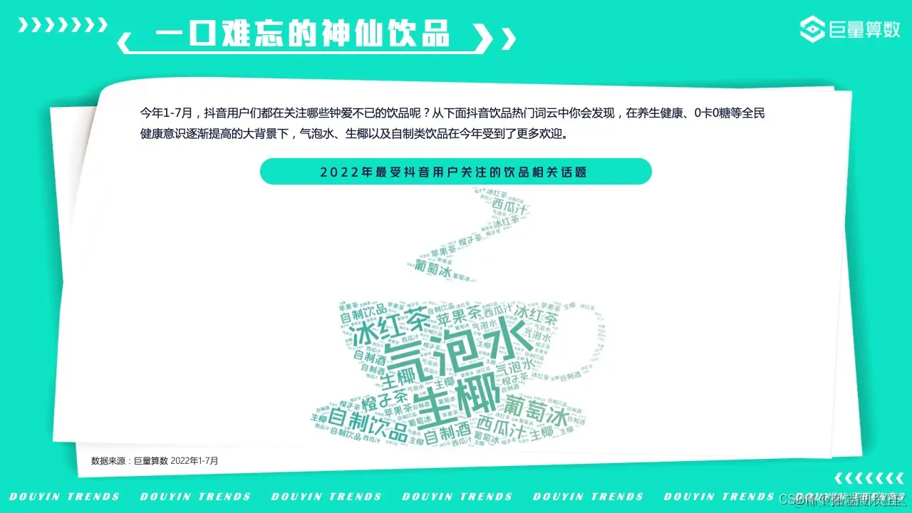 今年,抖音用户们都在关注哪些钟爱不已的饮品呢?在养生健康、0卡0糖等全民健康意识逐渐提高的大背景下,气泡水、生椰以及自制类饮品在今年受到了更多欢迎。