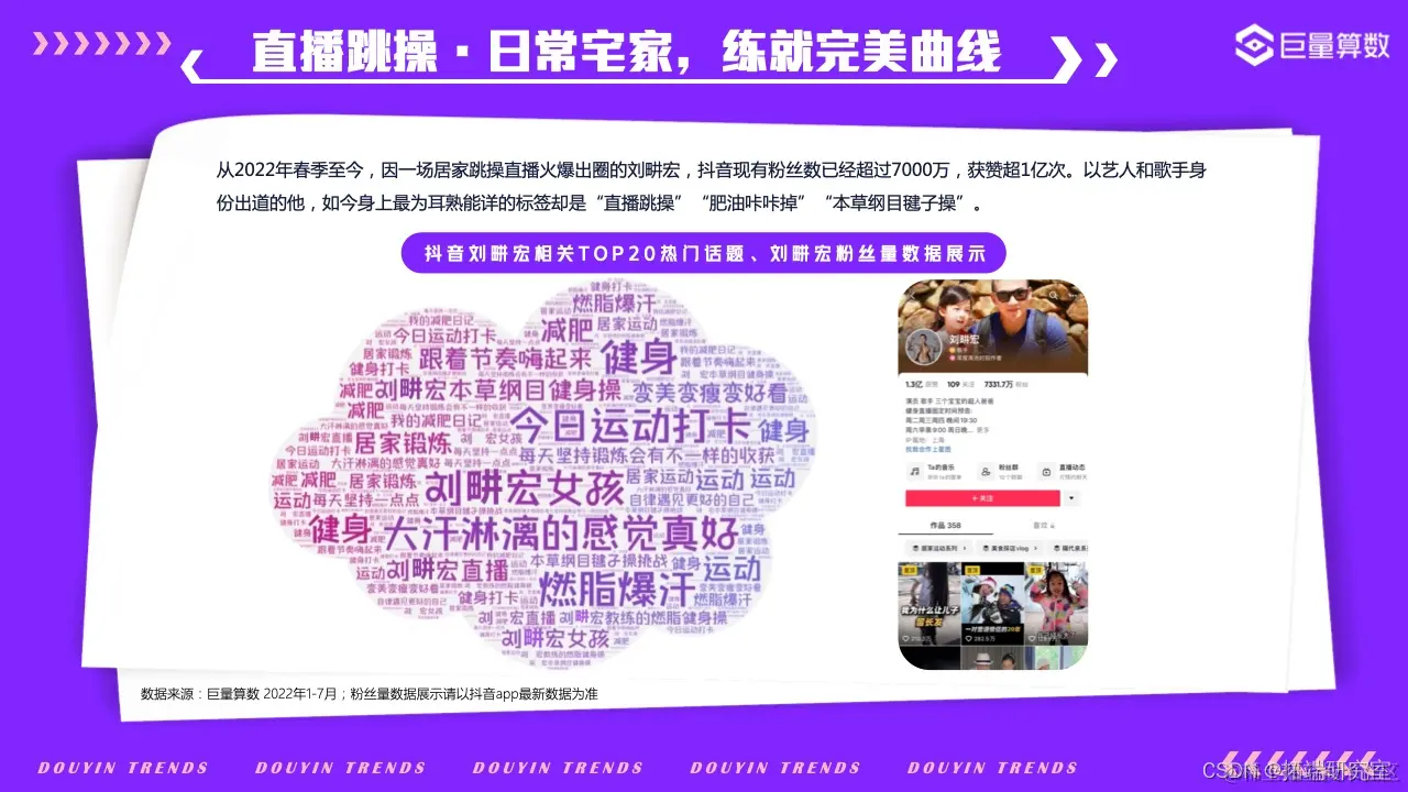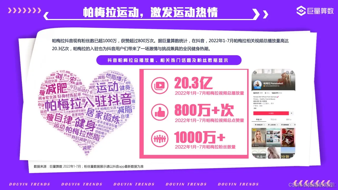 日常宅家,练就完美曲线,今年4月,帕梅拉正式入驻抖音,高强度健身挑战的直播热度火爆,激发了人们的运动热情。帕梅拉抖音视频播放量达20.3亿次,现有粉丝数已超1000万,获赞超过800万次。
