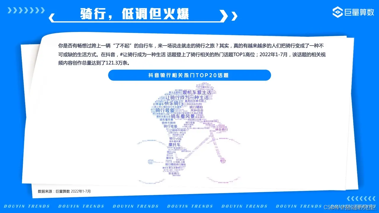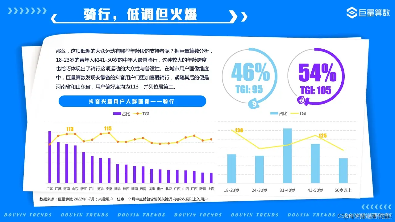 在抖音,#让骑行成为一种生活 话题登上了骑行相关的热门话题榜首;据巨量算数分析,18-23岁的青年人和41-50岁的中年人最常骑行。