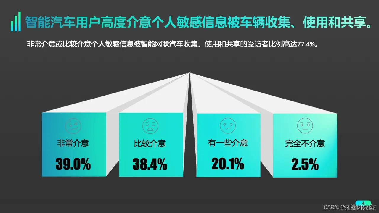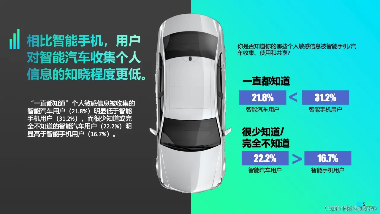 综合来看,高度介意个人敏感信息被智能网联汽车收集、使用和共享的受访者比例高达77.4%。其中,智能汽车用户对个人信息、车内摄像头拍摄画面信息、个人生物特征数据和地理位置及路线信息最为敏感。