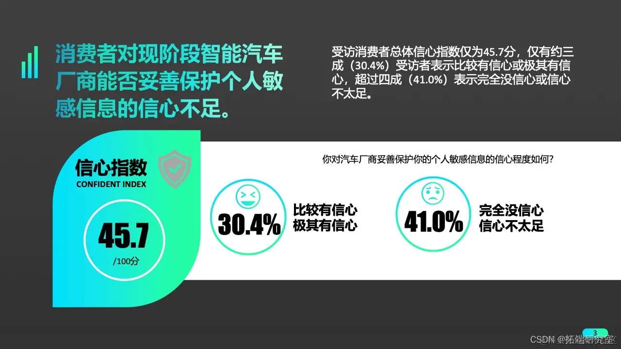 调查显示,中国消费者对现阶段智能汽车厂商能否妥善保护个人敏感信息的整体信心不足。受访消费者总体信心指数仅为45.7分(满分为100分),仅有约三成(30.4%)受访者表示比较有信心或极其有信心,超过四成(41.0%)表示完全没信心或信心不太足。
