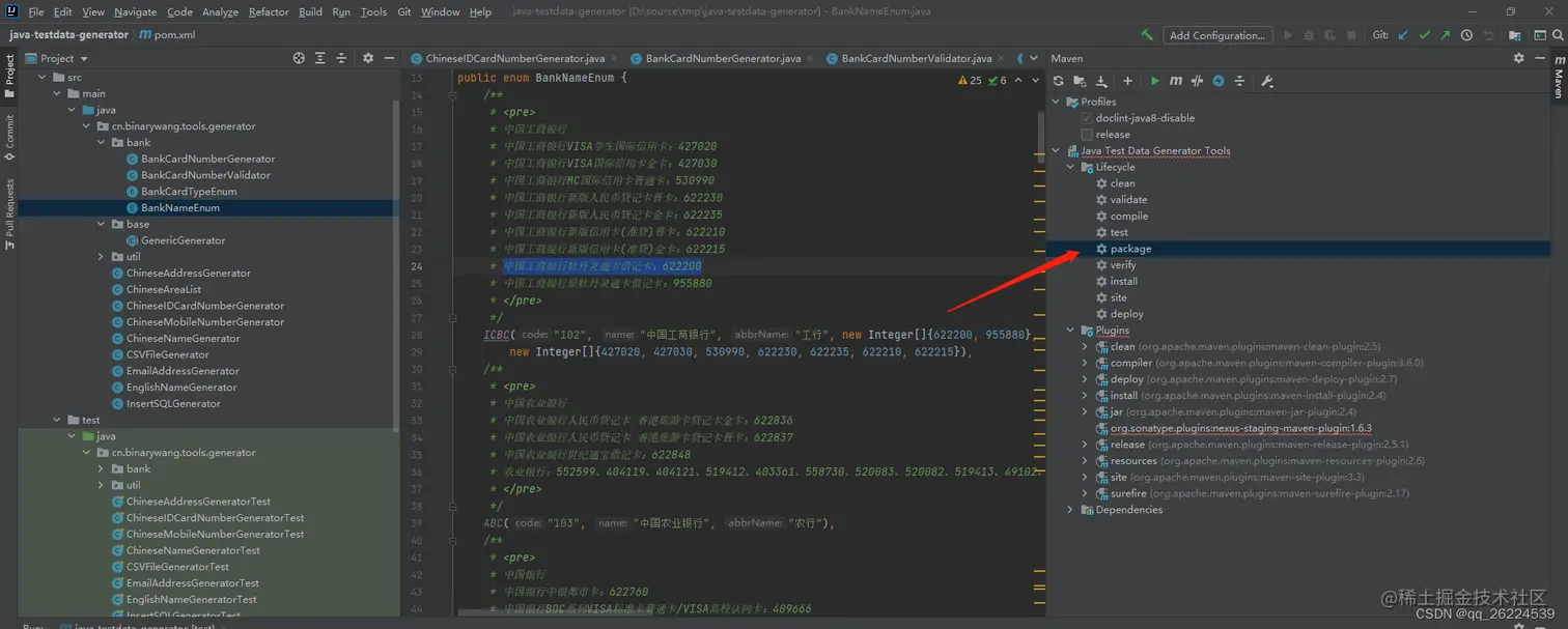 在很多实际项目中,需要的测试数据可能更复杂,比如生成各个主流银行的银行卡号,读者可以按照自己的需要对 github.com/binarywang/…