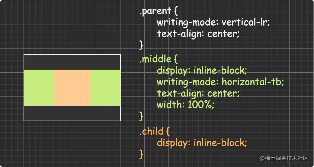 - 水平居中:当一个块要在环境中水平居中时,设置其为 inline-block 则会在外层产生 IFC,通过 text-align 则可以使其水平居中。