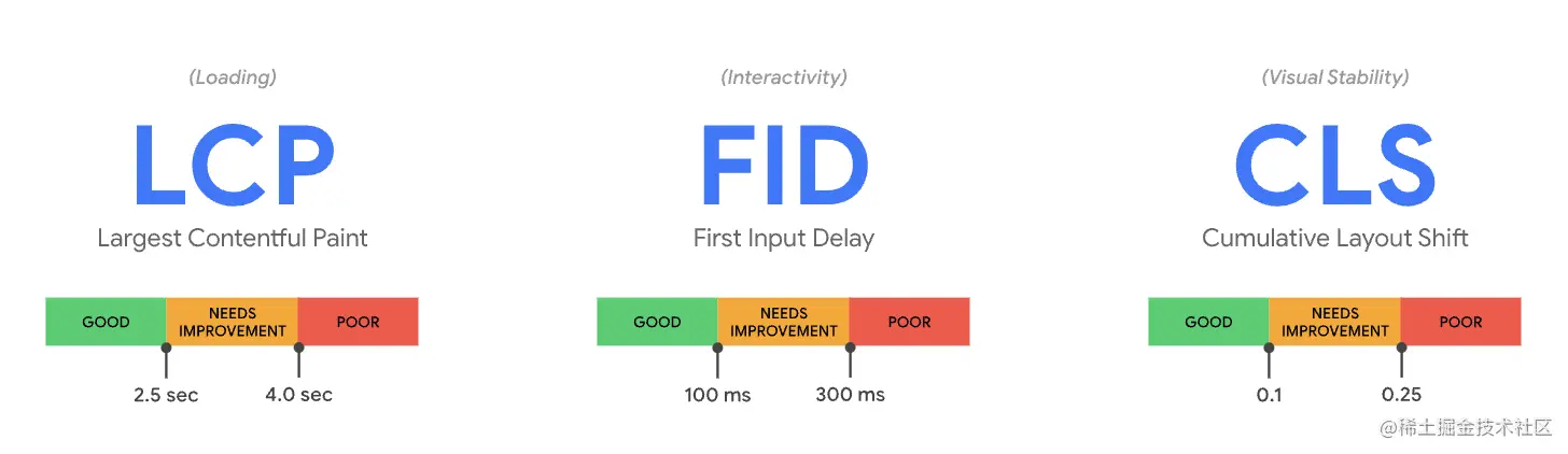 2020年 Google 提出了新一代 Web 性能体验指标 Core Web Vitals,其中包括了 LCP、FID、CLS 三大指标。