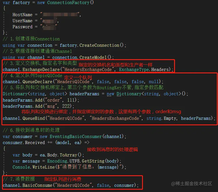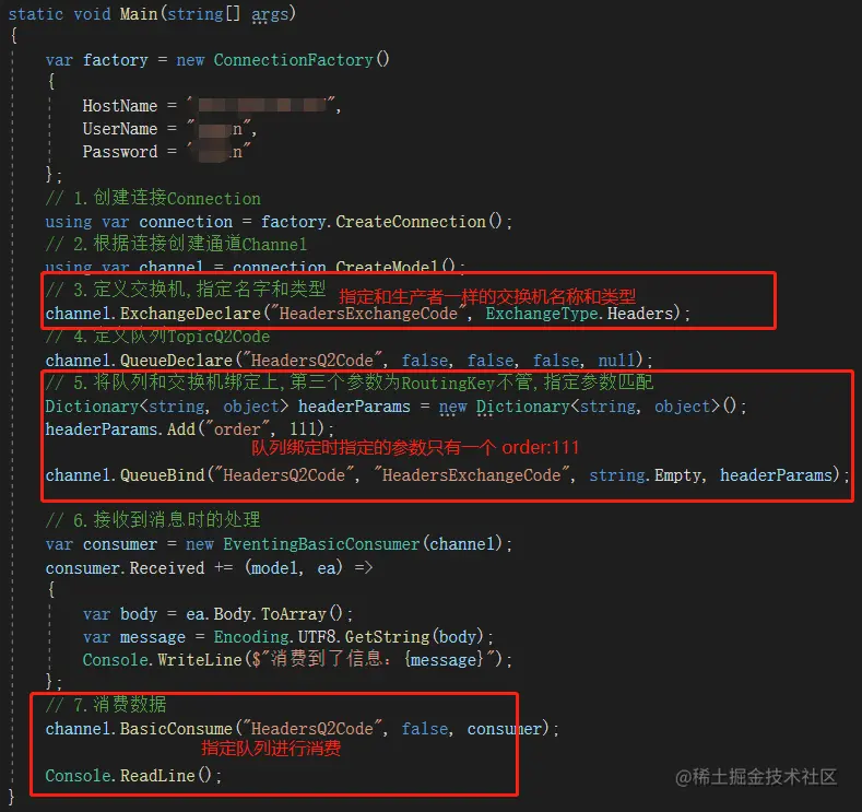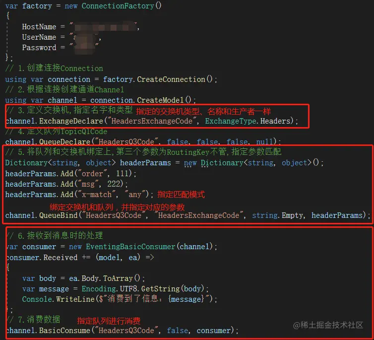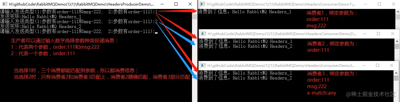 代码中关键的部分是指定交换机的类型为Headers,然后模拟了两类参数的形式投递消息,方便用于测试参数匹配模式的测试。