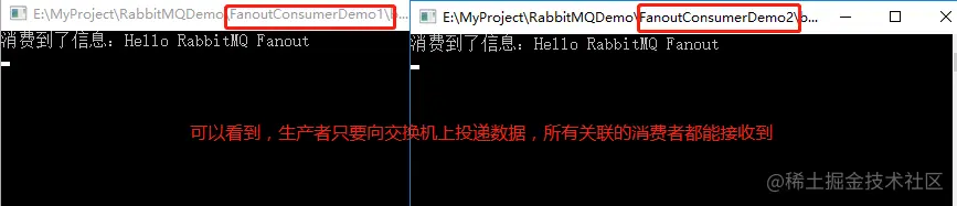 此时通过FanoutExchange交换机投递消息,绑定到此交换机上的队列都能收到: