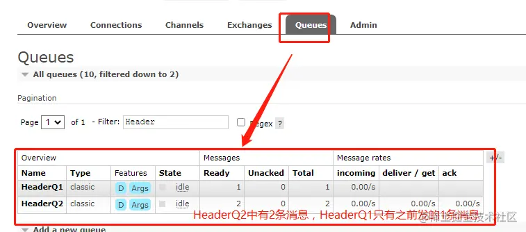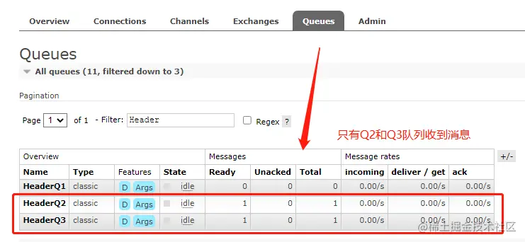 此时只有HeaderQ2才能精确匹配,HeaderQ1没有全部匹配,所以对应队列没有收到消息,如下: