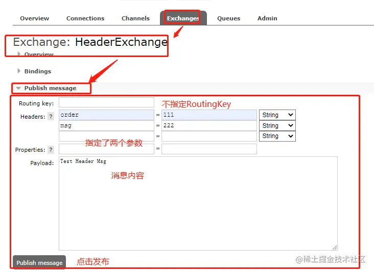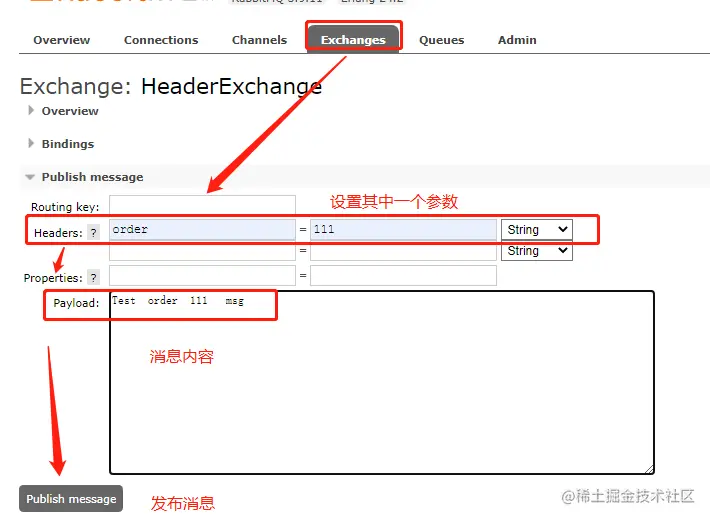 这里不使用RoutingKey的方式,而是通过设置参数的形式进行绑定,后续投递消息的时候就匹配参数,如果能匹配上,就将消息投递到对应的队列。