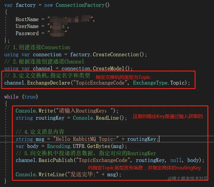 在Direct的代码基础上稍微改动即可,主要改动点就是改变交换机的类型,并在队列和交换机绑定时设置对应的RoutingKey,这里的RoutingKey是一个规则,是星号、#号、点号和每个词的组合,发布消息的时候指定交换机和RoutingKey,RoutingKey会去匹配绑定的规则。