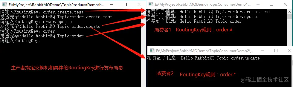 如上演示效果,和Web演示一样,只有精确匹配到RoutingKey才能消费到对应的消息数据。