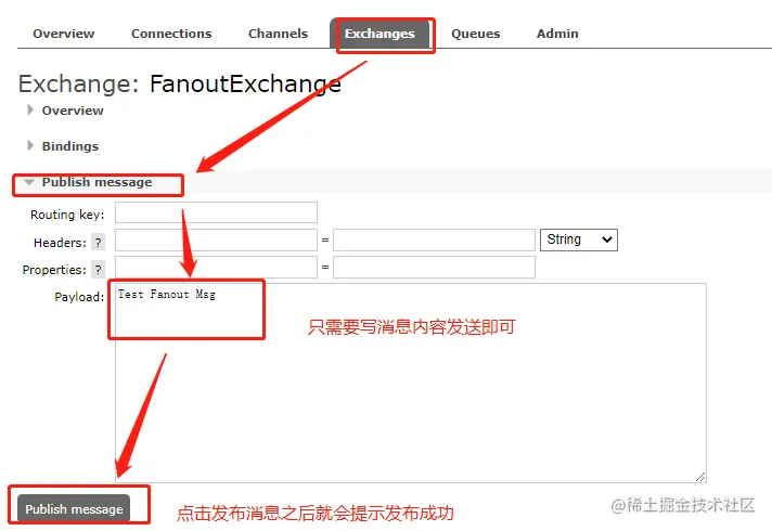 因为Fanout交换机不用关注RoutingKey,所以在发布消息时,第二个参数不需要传递RoutingKey。