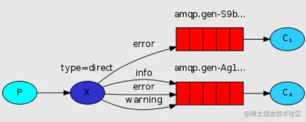 - 中间箭头上的error、info、warning代表具体的RoutingKey;