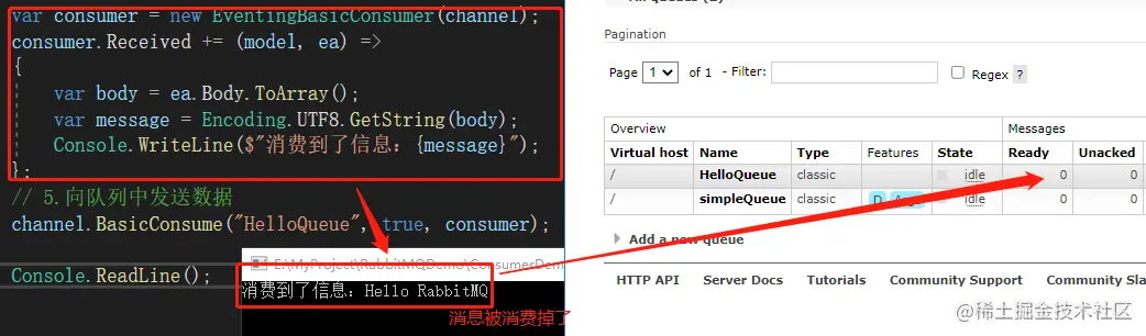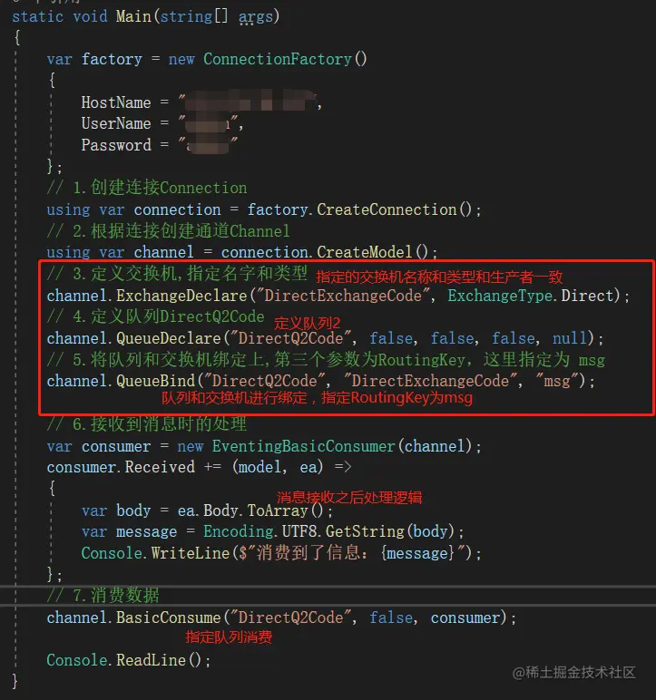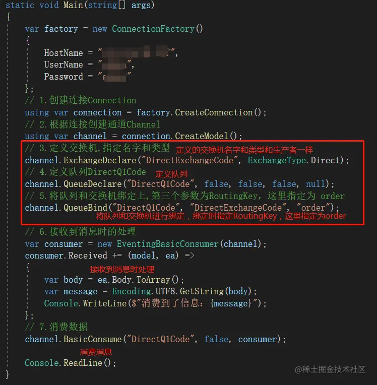 在整个过程中,还是会先建立连接,创建通道,指定队列; 不同的是增加对接收数据的处理。