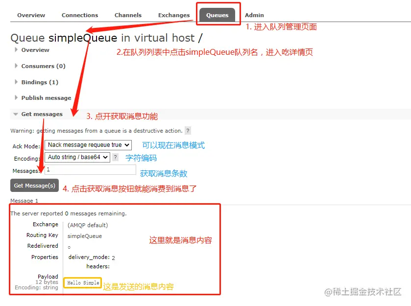 队列里面有了消息之后,就可以模拟消费者进行消息消费,点击队列名进入详情,可在详情也模拟消费: