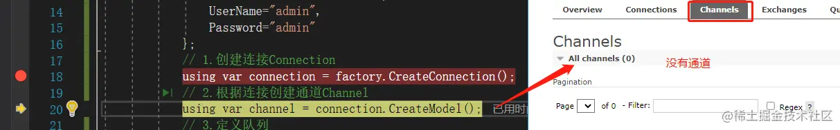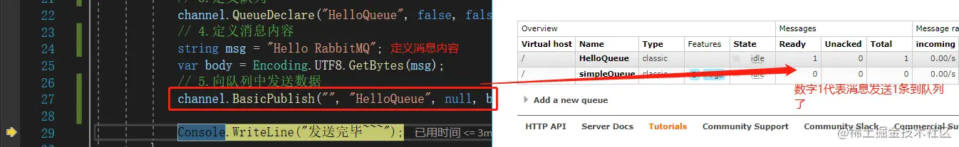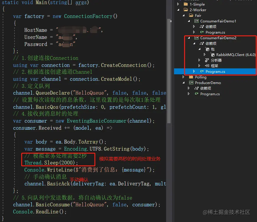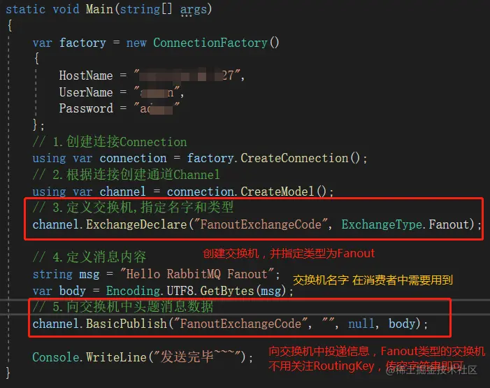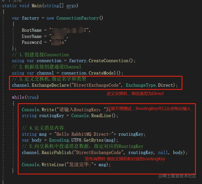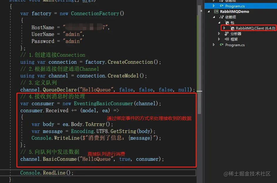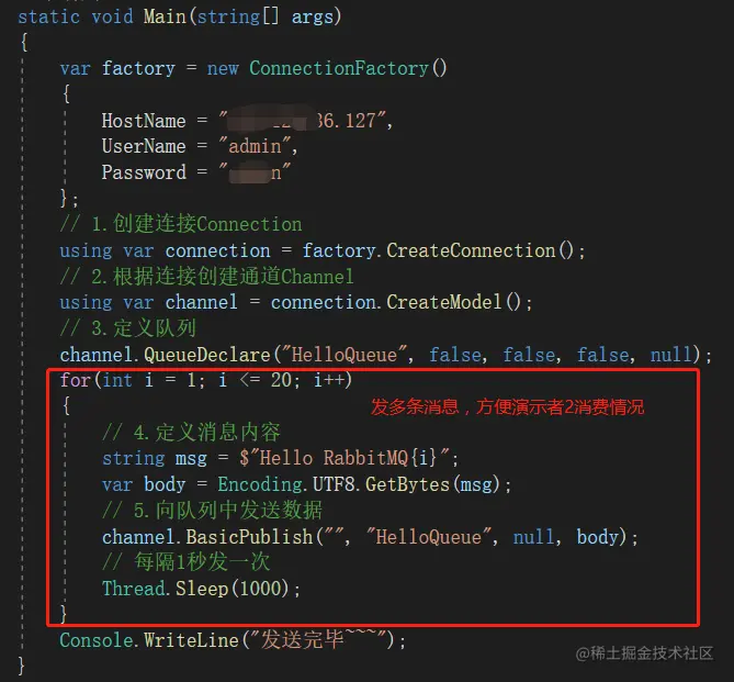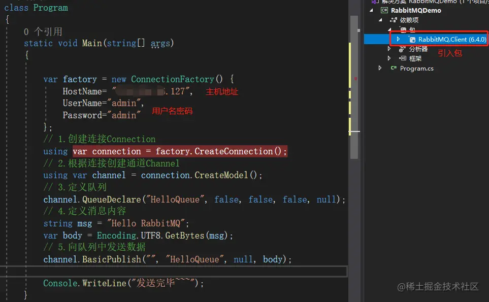 这里就用控制台的方式,一步一步的实现。这里需要引入Nuget包:RabbitMQ.Client。生产者的整体代码如下: