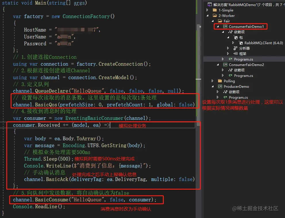 - 设置每次消费的消息条数,可以根据实际业务情况配置,这里设置的是每次取一条。通过 channel.BasicQos进行设置。