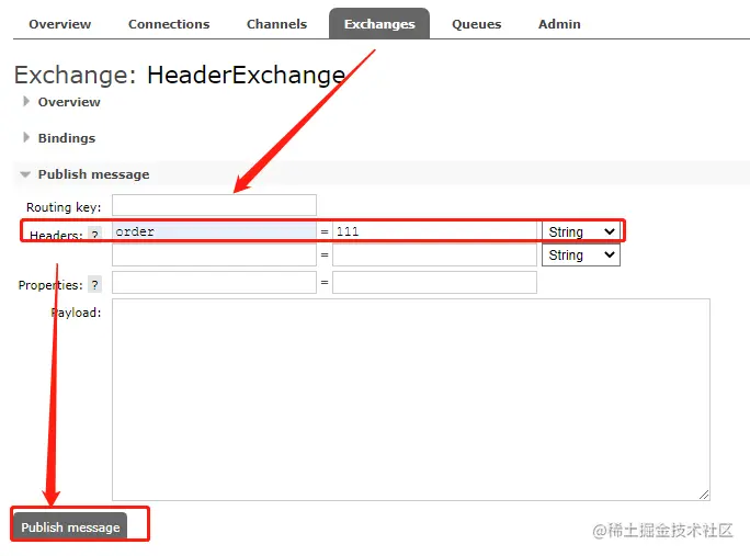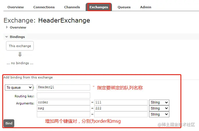 同样的方式绑定HeaderQ2队列,只是只添加了一个键值对,order:111,最后HeaderExchange交换机的绑定关系如下: