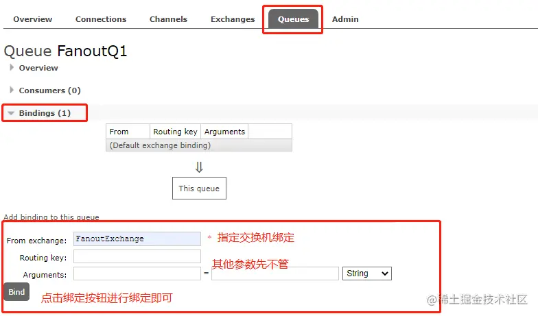 在队列详情页或交换机详情页都可以进行交换机和队列的绑定,这里分别在FanoutQ1和FanoutQ2队列详情页进行绑定,如下: