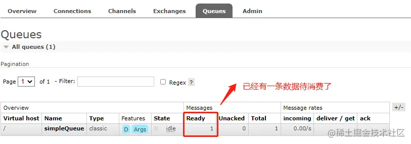 消息发送成功之后就会在队列界面看到消息情况: