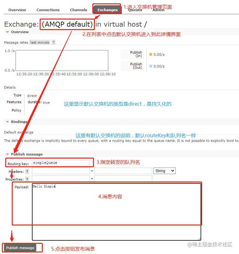 有了绑定关系之后,就可以在默认的交换机页面开始模拟转发消息;首先进入Exchanges管理页面,点击**默认交换机(AMQP default)**进入详情开始发布消息: